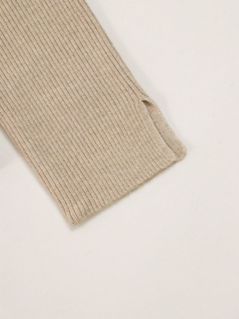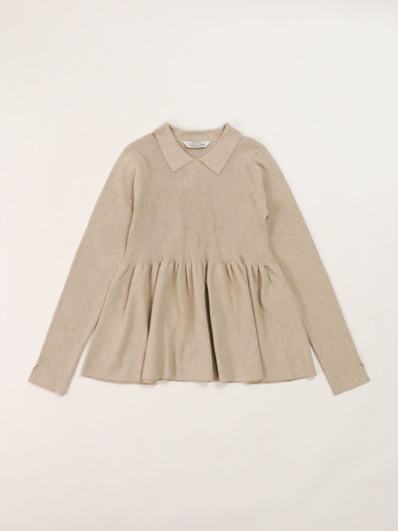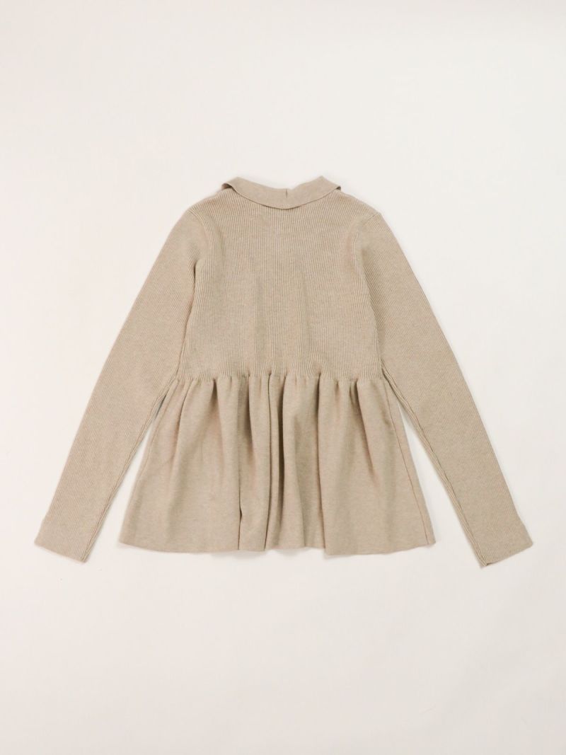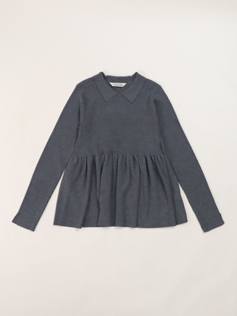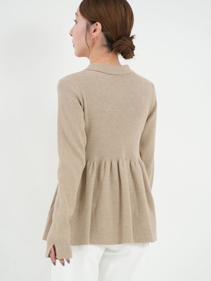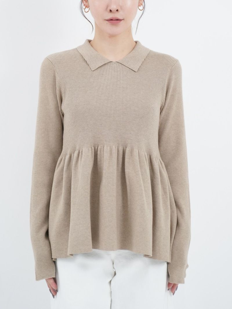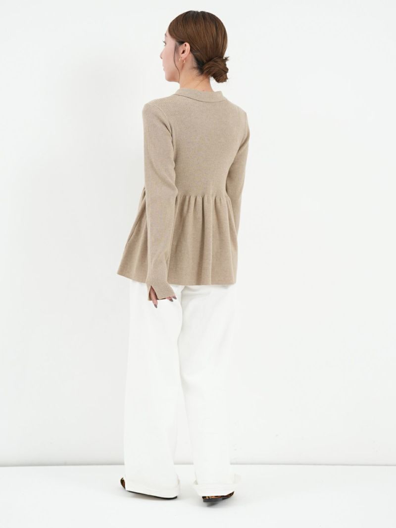 1枚で主役になるデザインニット。 身頃はリブ編み、ウエストからギャザーを入れた切り替えで女性らしいシルエットを演出します。高めに設定した切り替え位置が、自然にスタイルアップして見せてくれるのも嬉しいポイント。伸縮性があり、ちくちくしない素材なので、ウールが苦手な方にもおすすめです。