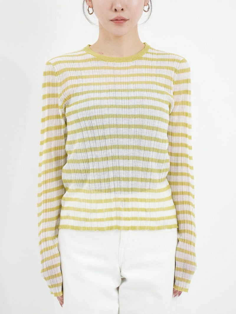繊細な糸で編んだインナーニット。 ランダムリブによる程良い透け感がありつつ、安心できる着心地がポイント。新鮮なボーダーカラーは1枚あると幅広いレイヤードスタイルに活躍します。