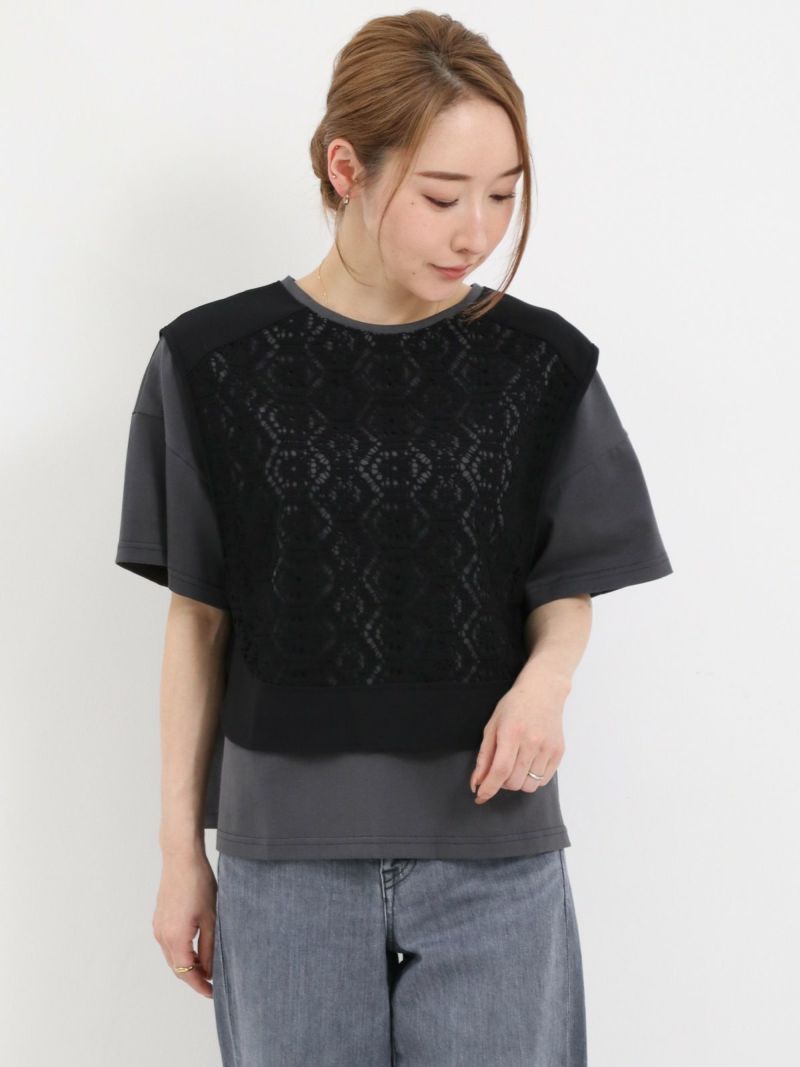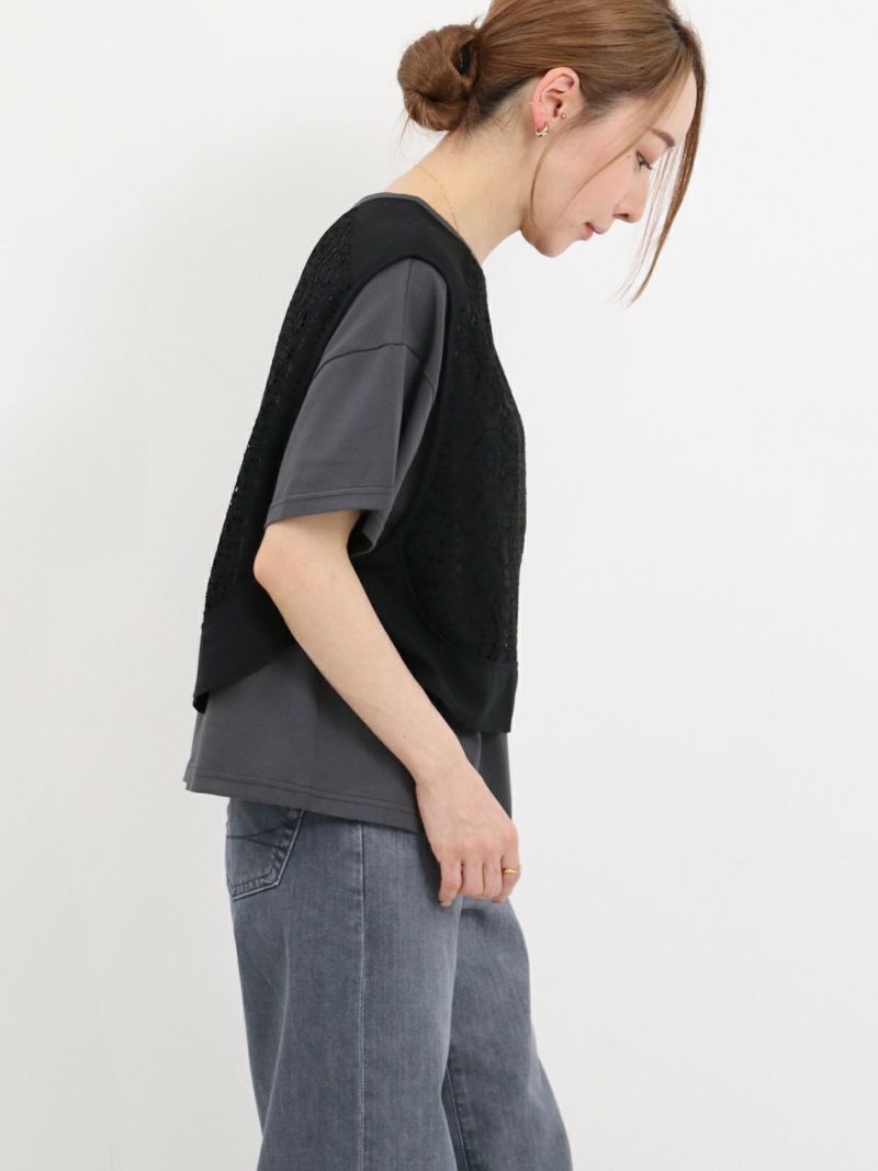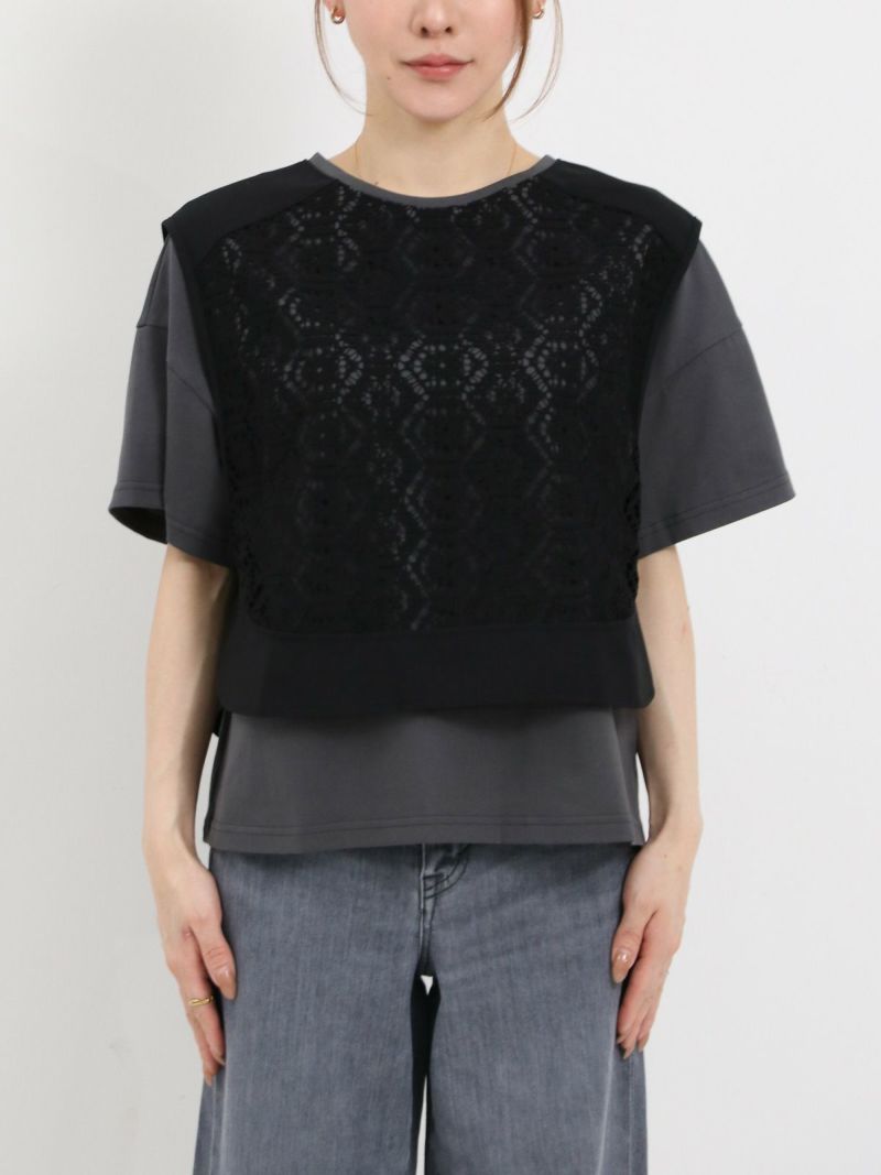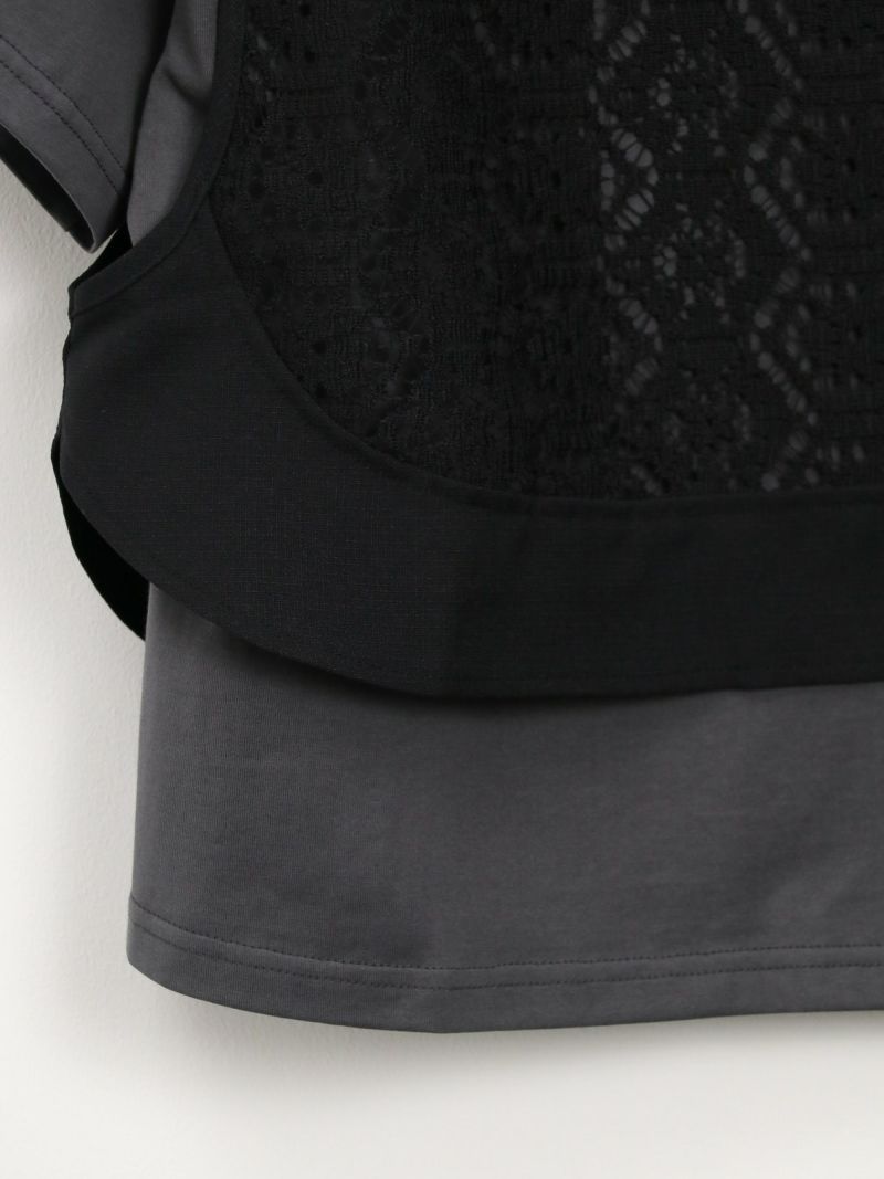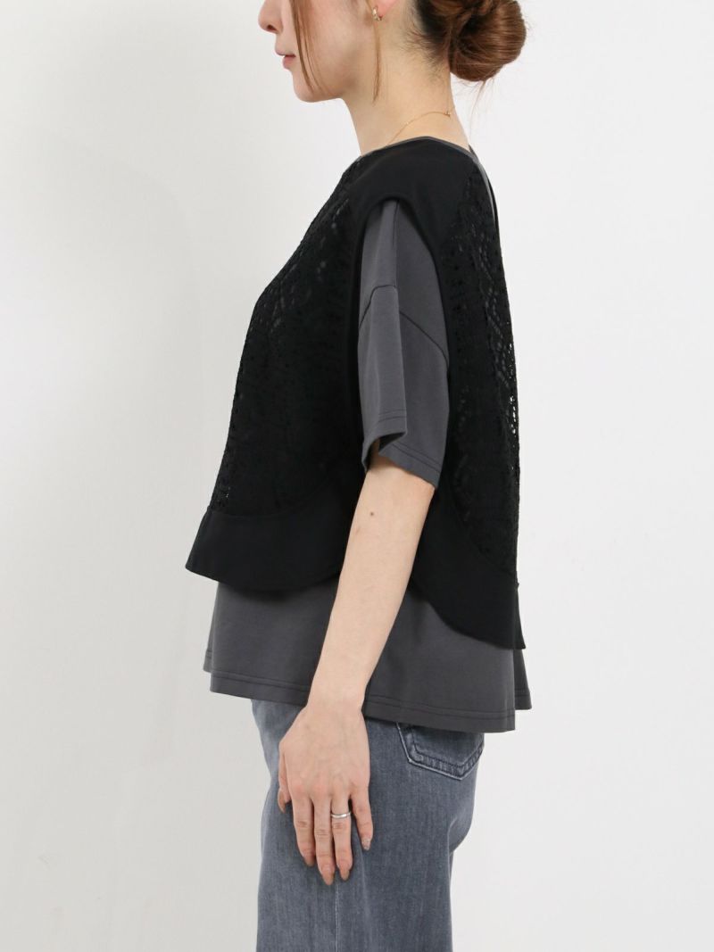肌触りの良い上質なコットン100%のシルケット素材のレイヤードプルオーバー。 前後2wayで着用可能で、繊細なレースがカジュアルスタイルを品良くまとめてくれます。