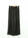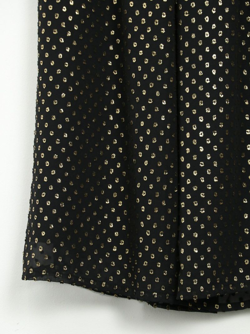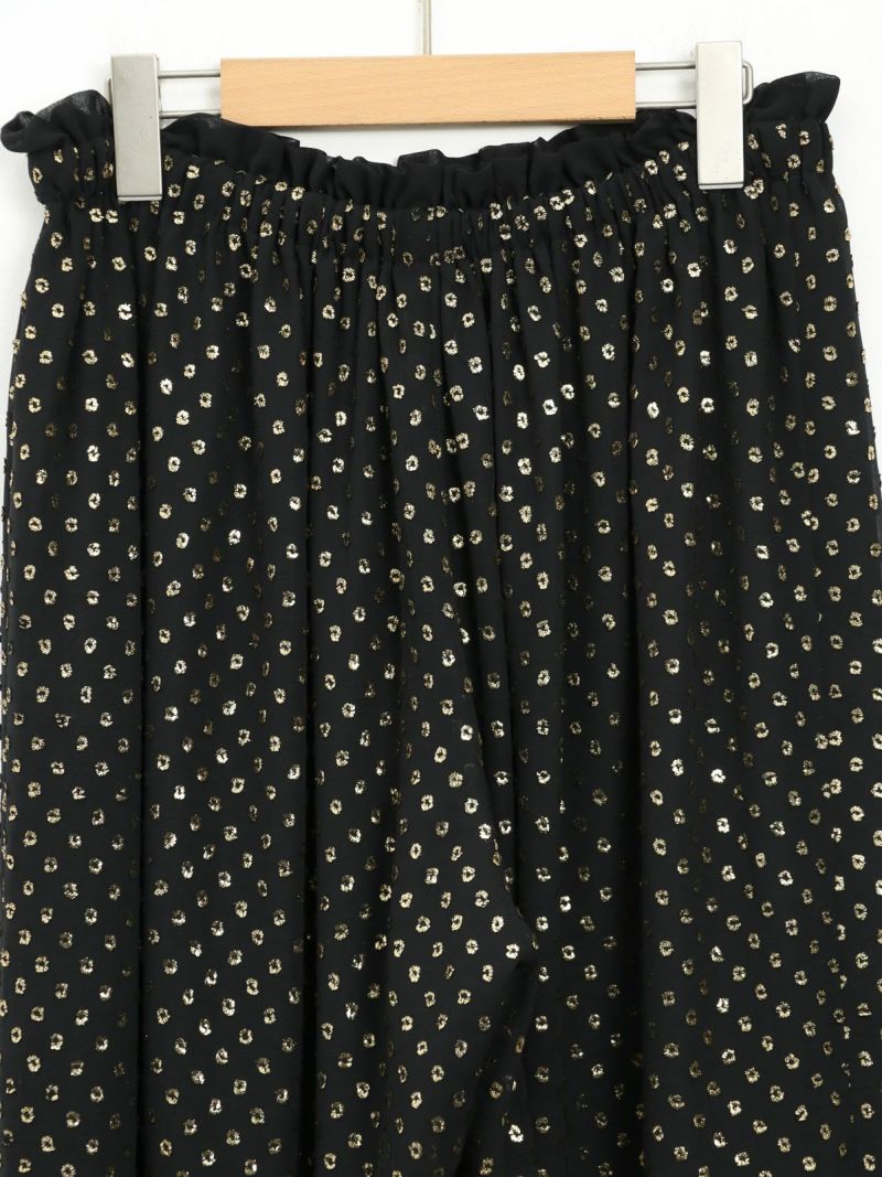 薄く柔らかいドット柄のジャガードと無地のシフォンを使ったワイドギャザーパンツ。分量を多くとったギャザーで動きやすく腰回りをスッキリカバーしてくれます。