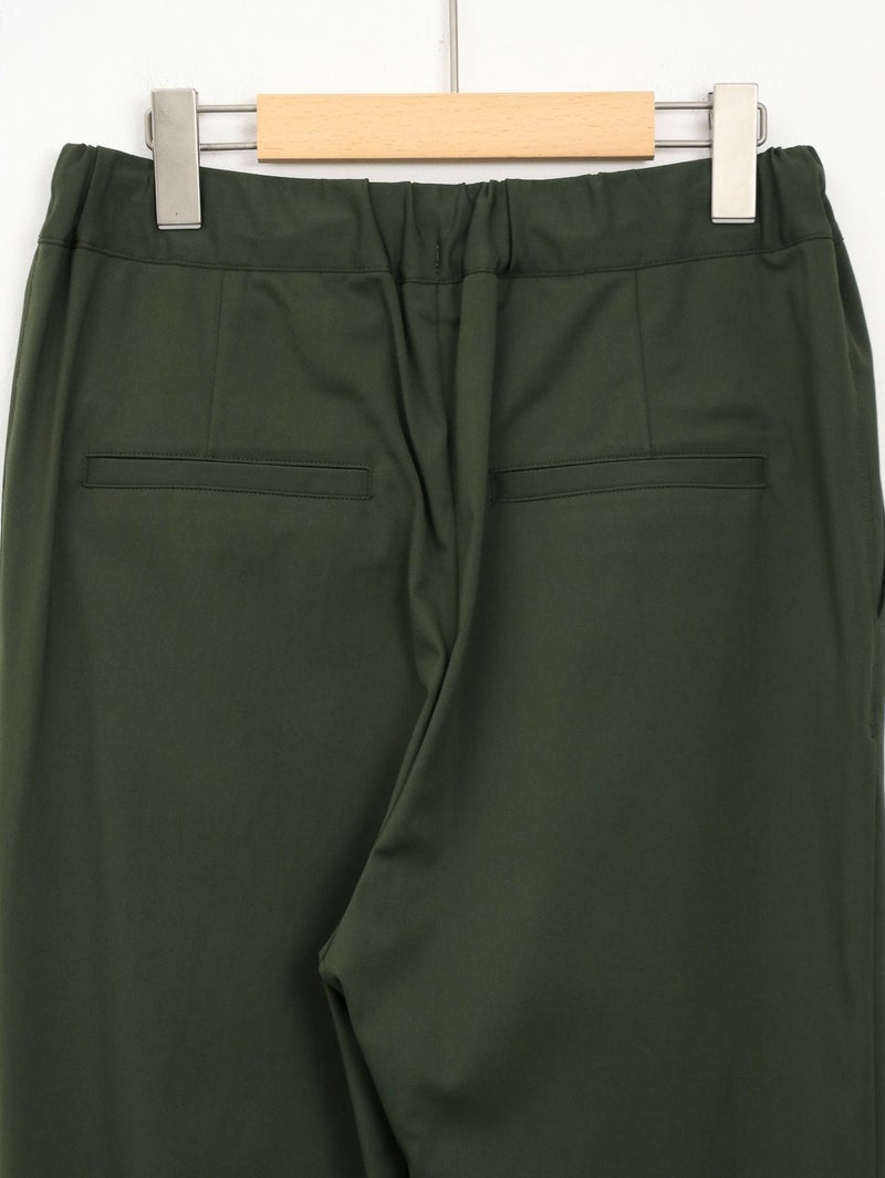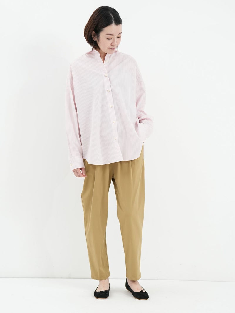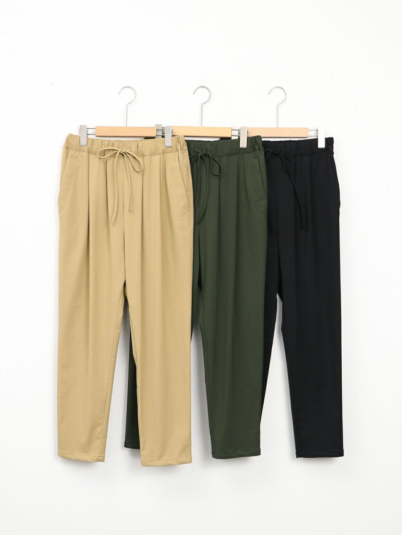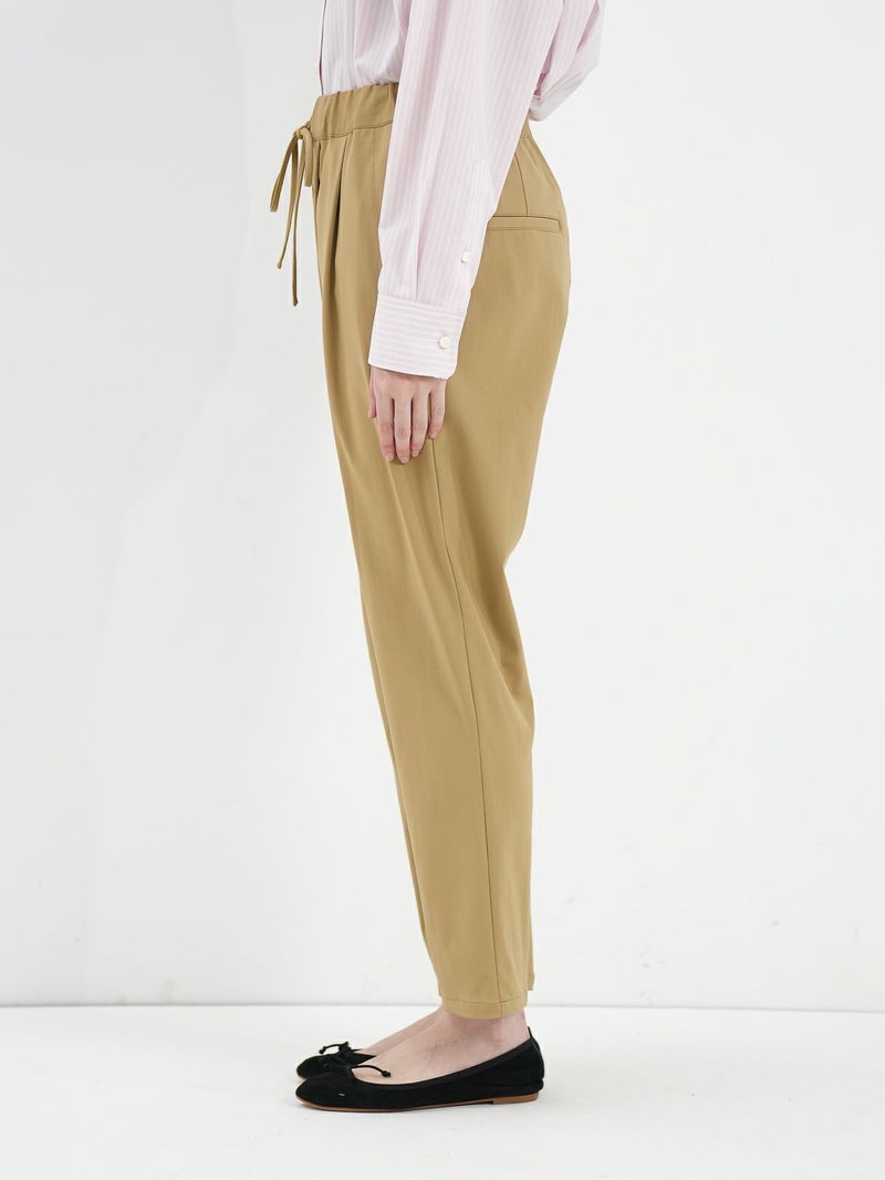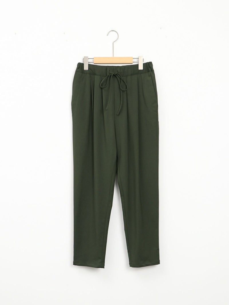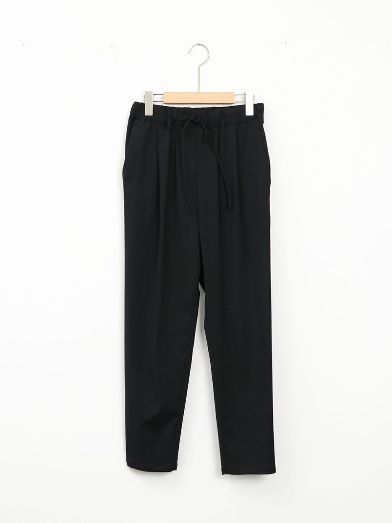 腰回りにタックでゆとりを持たせ、足首にかけてはタイトなラインに馴染むように仕上げたルーズテーパードパンツ。 ウエスト部分は太めの総ゴム仕様で引き締め感と快適な穿き心地を両立させたどんなスタイルにも馴染む一着です。