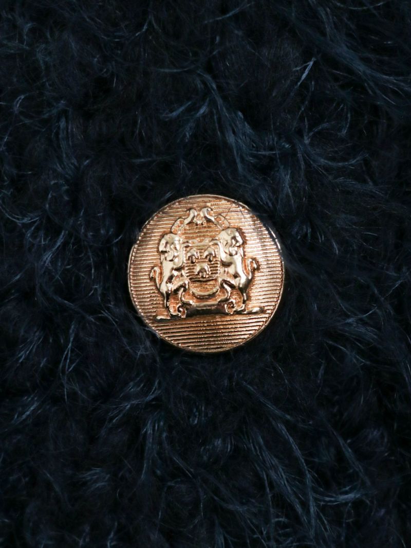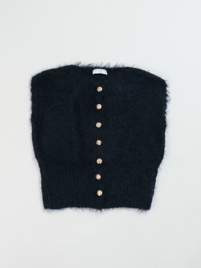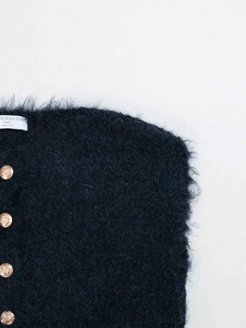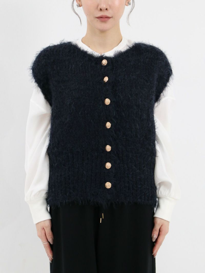 テクニック無しで着映える金ボタンのニットベスト。柔らかい肌触りが特徴で、程良い開きのクルーネックタイプ。