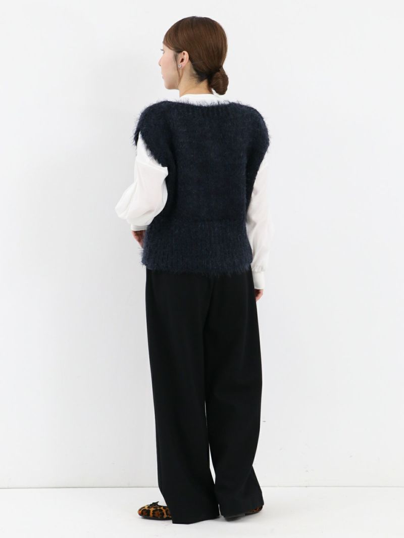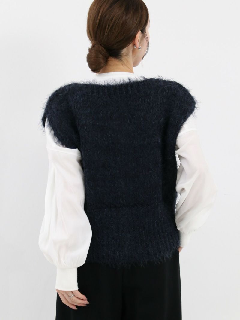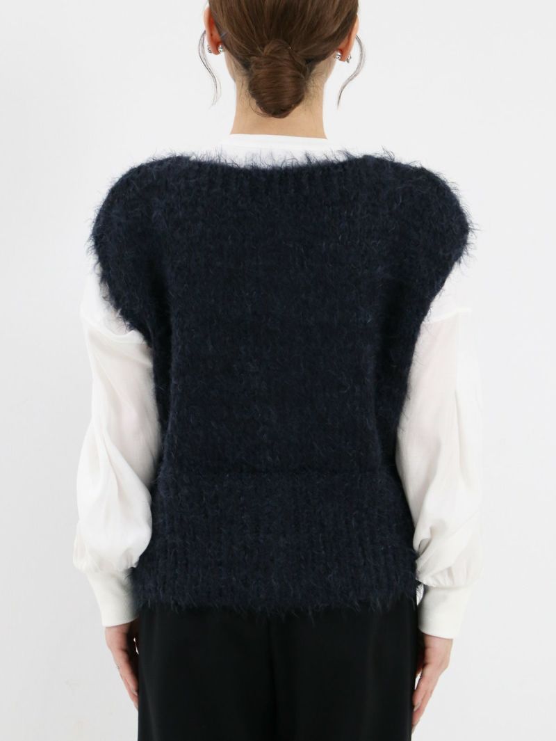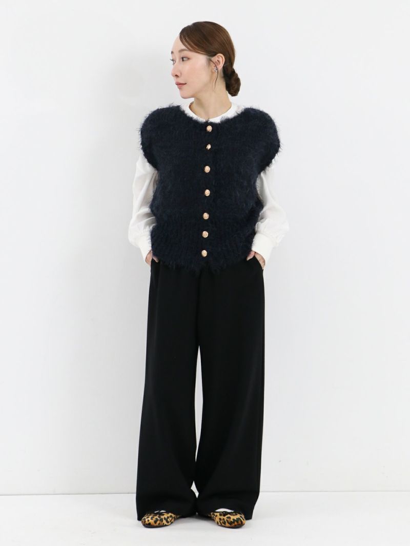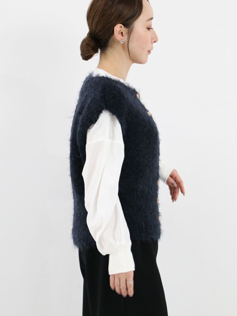 テクニック無しで着映える金ボタンのニットベスト。柔らかい肌触りが特徴で、程良い開きのクルーネックタイプ。