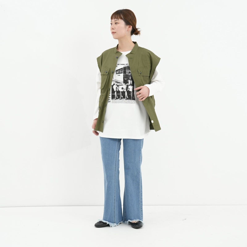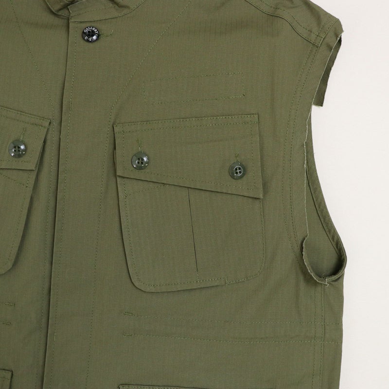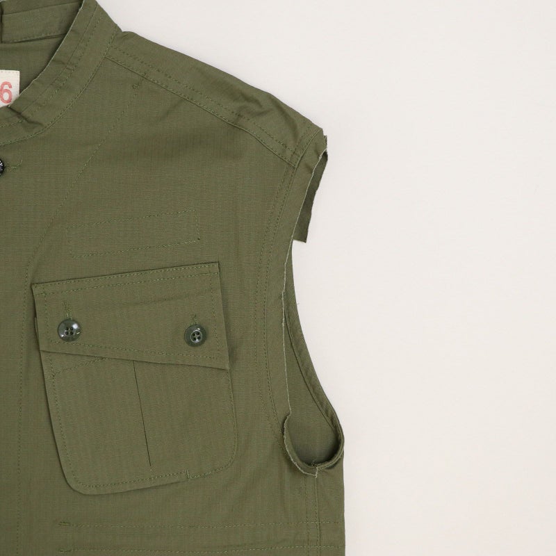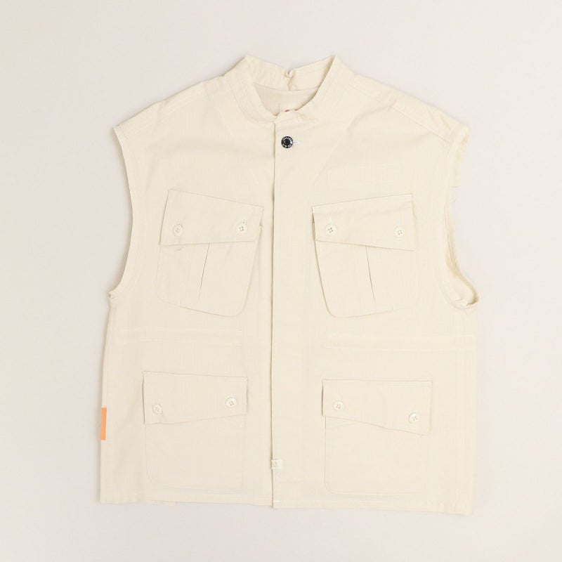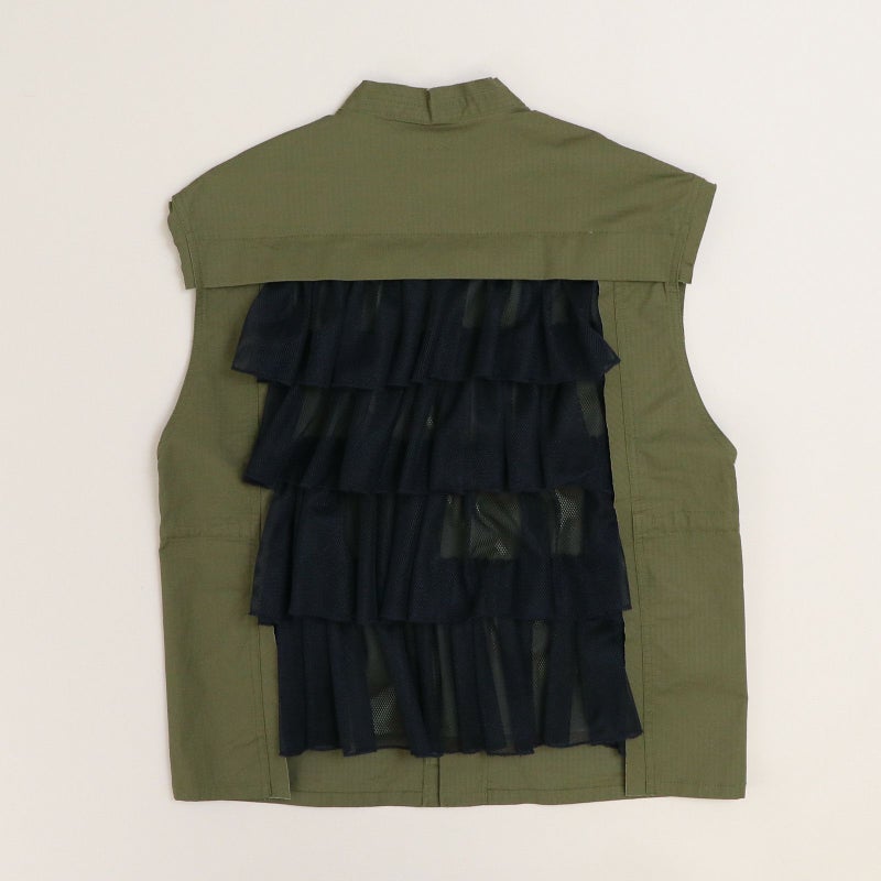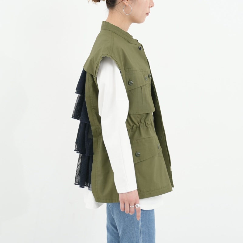 1960年代ベトナム戦争に使用された、ジャングルファーティーグジャケットをオマージュしつつベスト型にリモデル。 フェミニンさとハードなミリタリーの相反するデザインを融合させた特別なアイテムです。