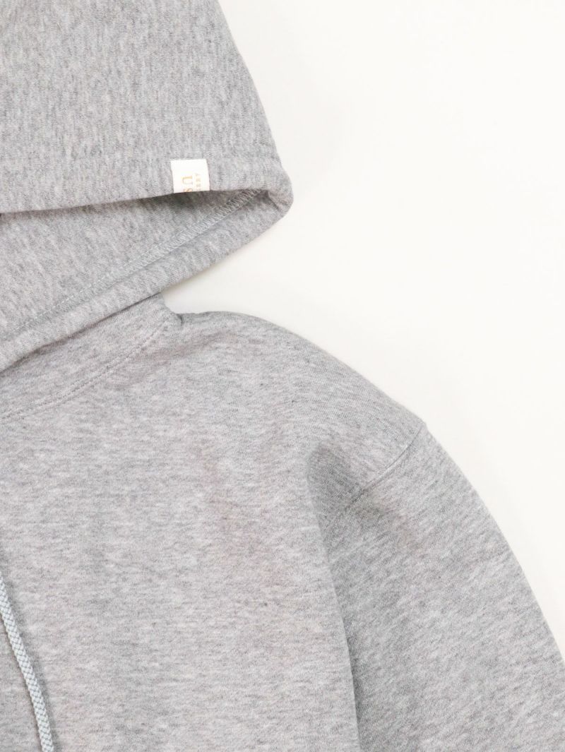 カレッジパーカーのプリントデザインを上下逆さまにして後ろ見頃にあしらいました。フードの立ち上がりやシルエットも計算された特別なパーカーです。