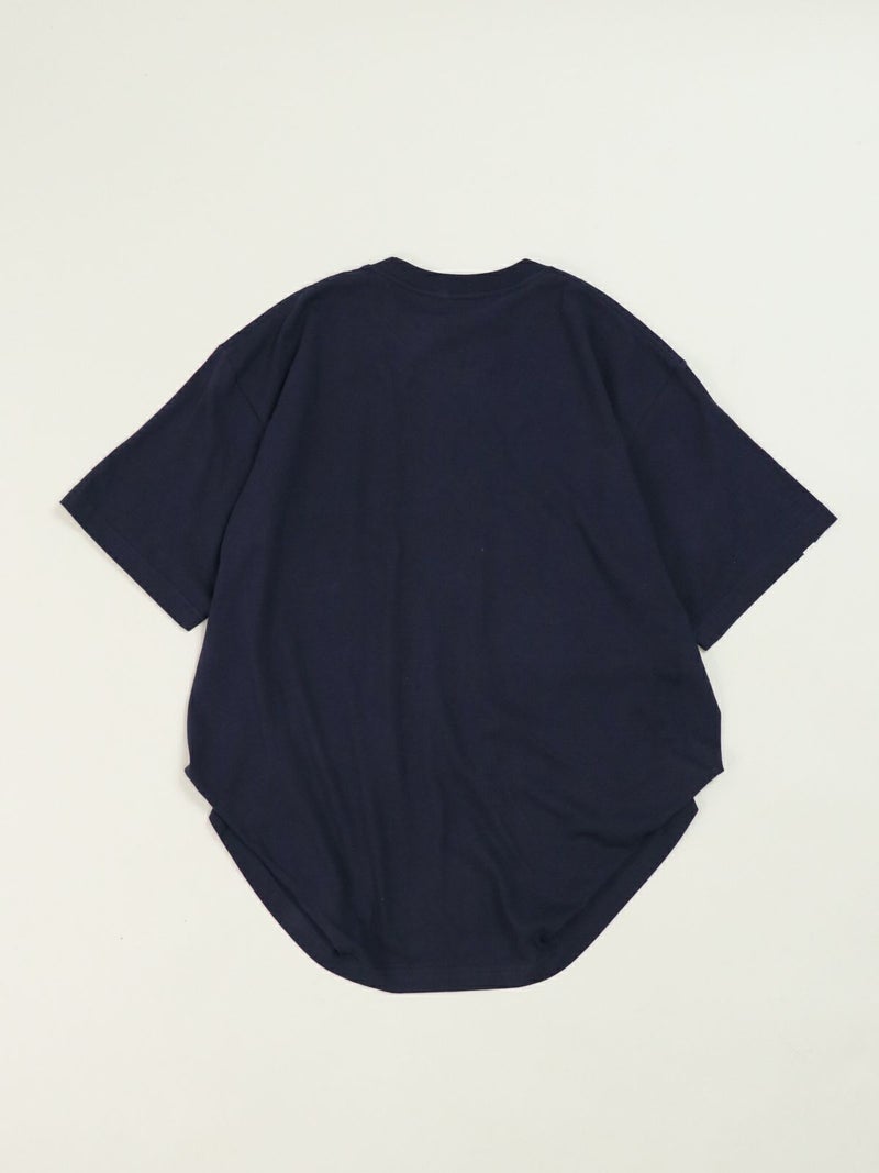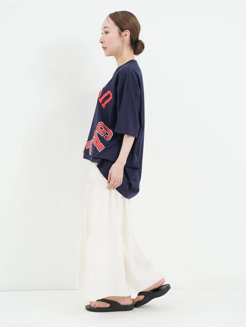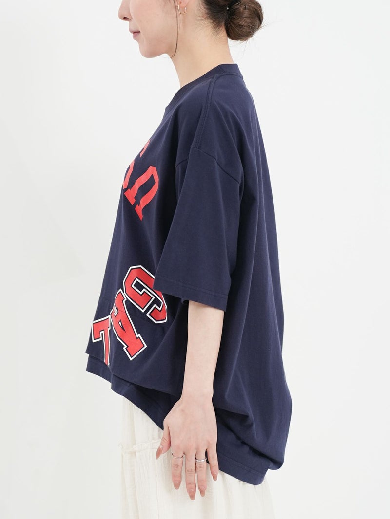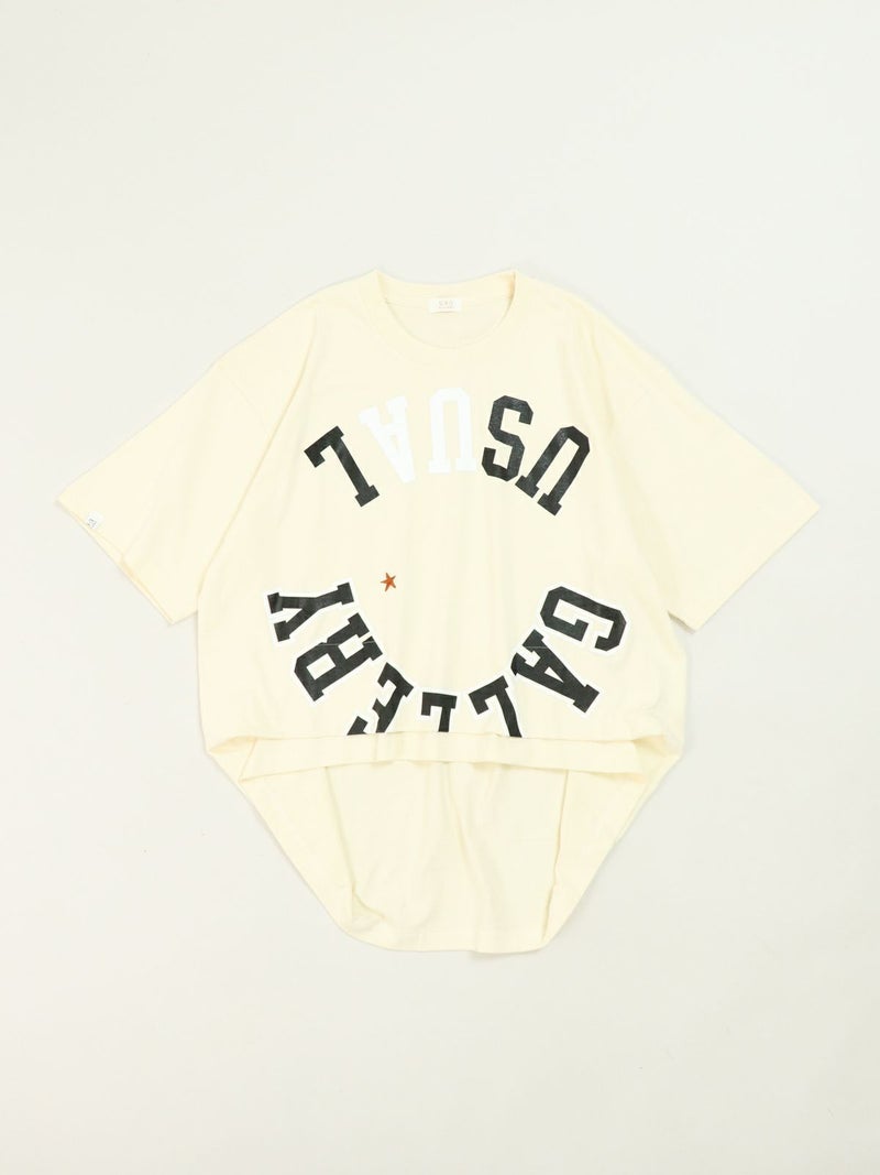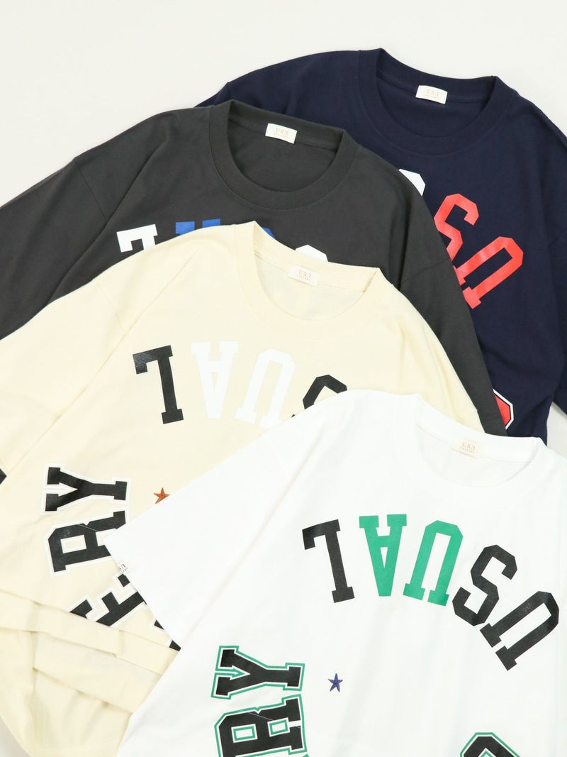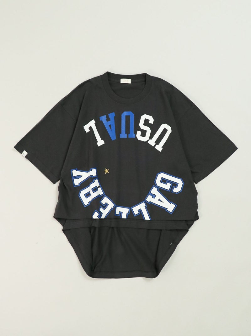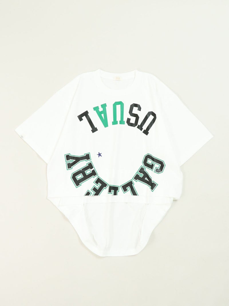 リメイク風にロゴを反転させたカレッジTシャツ。 インパクトのあるロゴにワンポイントでスター刺繍を施しました。両裾をつまんだようにタックを取り。シルエットにも動きを出し、前後で着丈差を付けたUSUらしい特徴的なデザインのTシャツです。