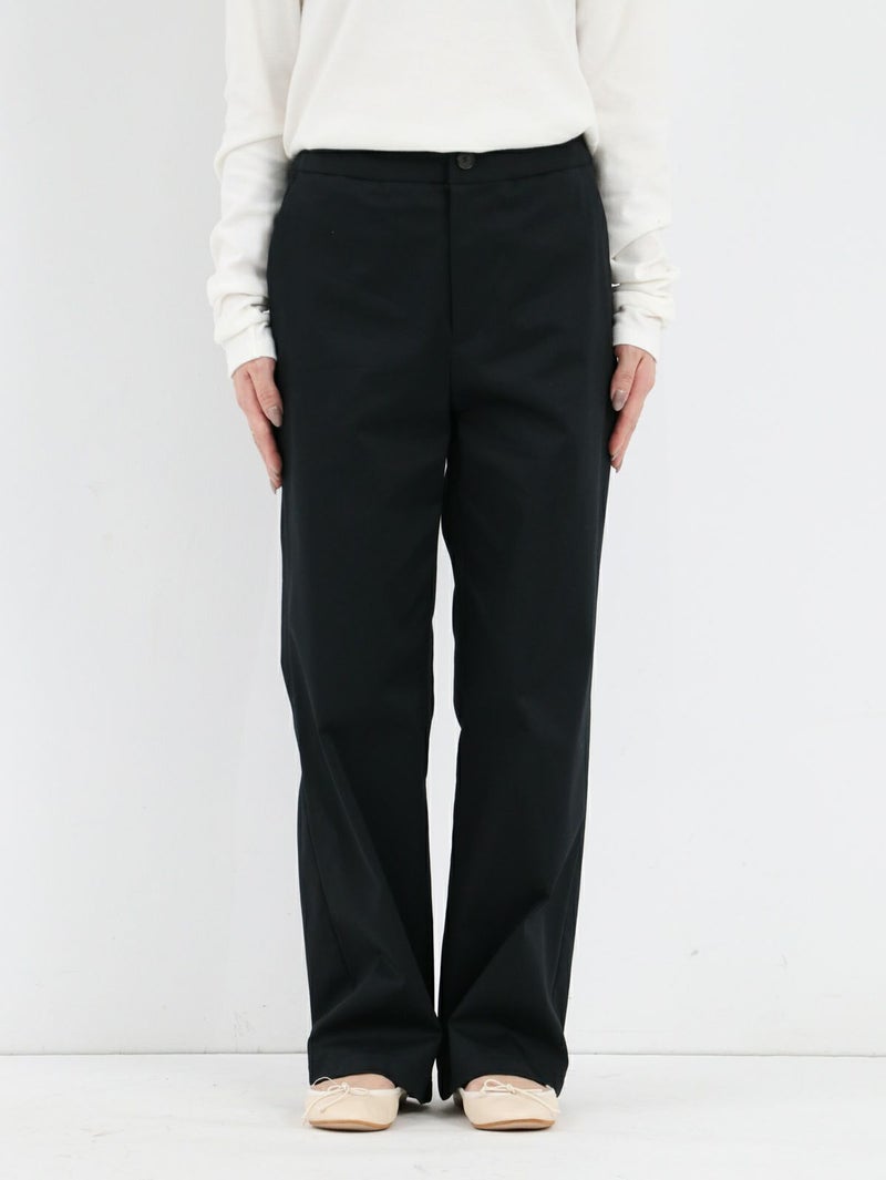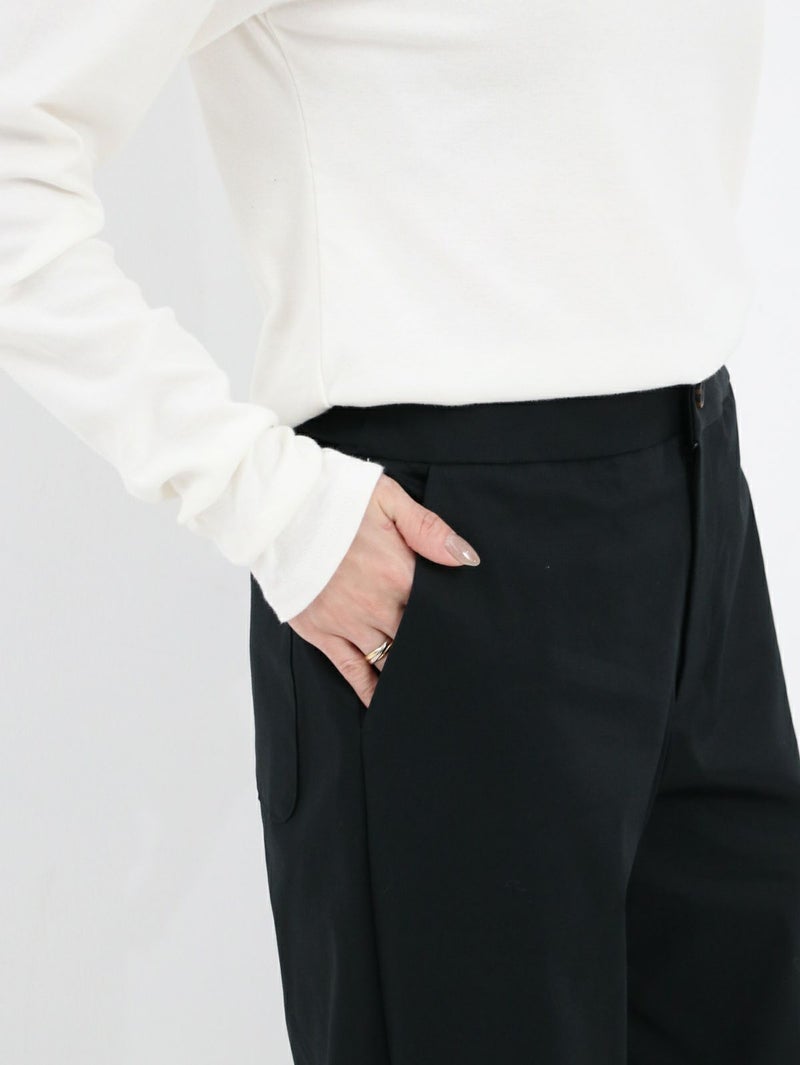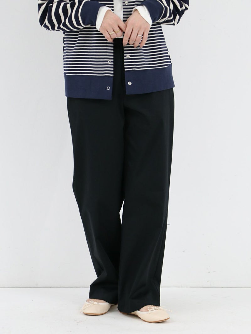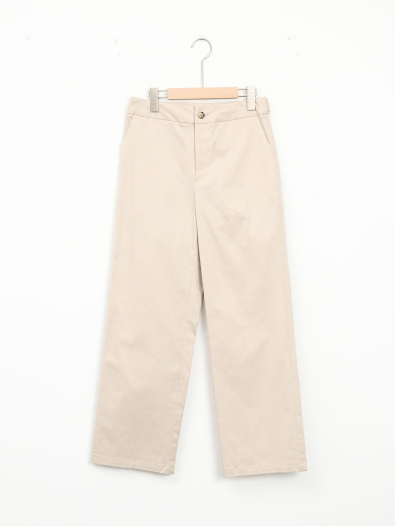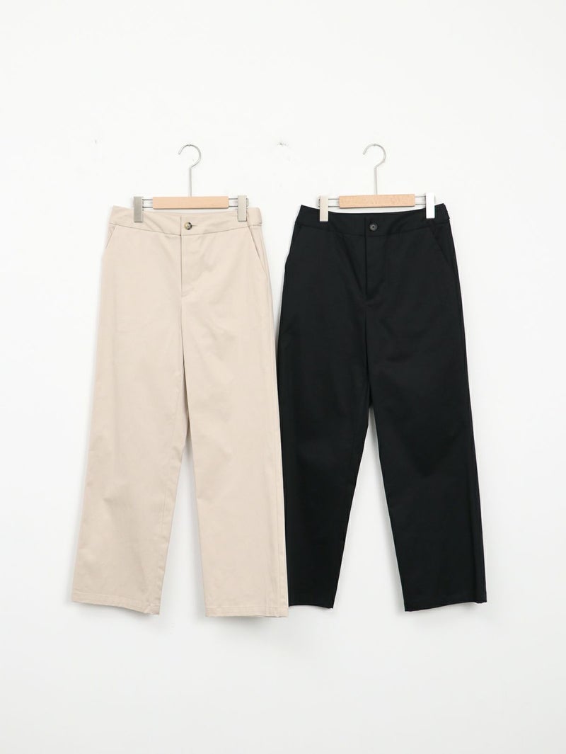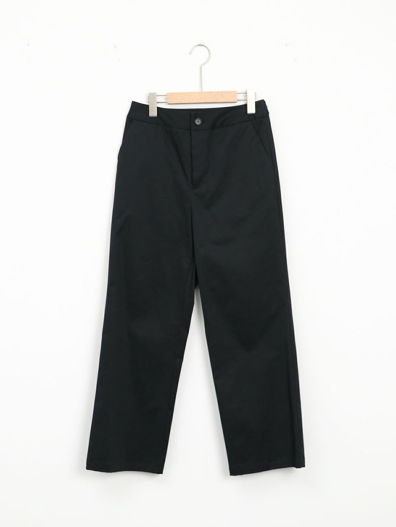 糸ムラがなく均一で高級感のあるコーマツイルを使用したパンツ。 程よくゆとりのあるスッキリとしたシルエットでオフィスカジュアルにもオススメな一枚です。 ウエストサイドにサイズ調整用のボタンが付いており、片側3cmずつ調整が可能です。