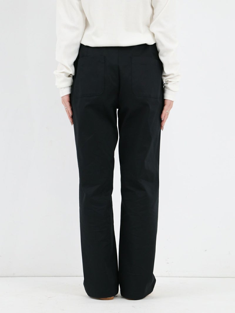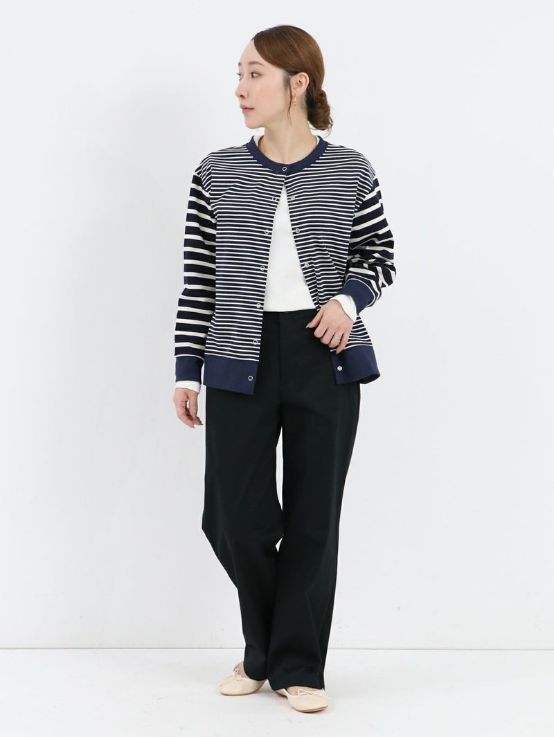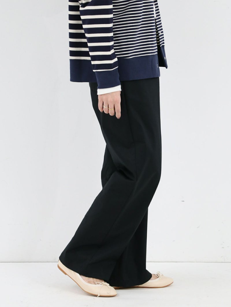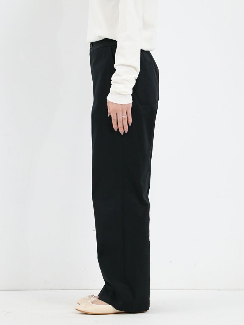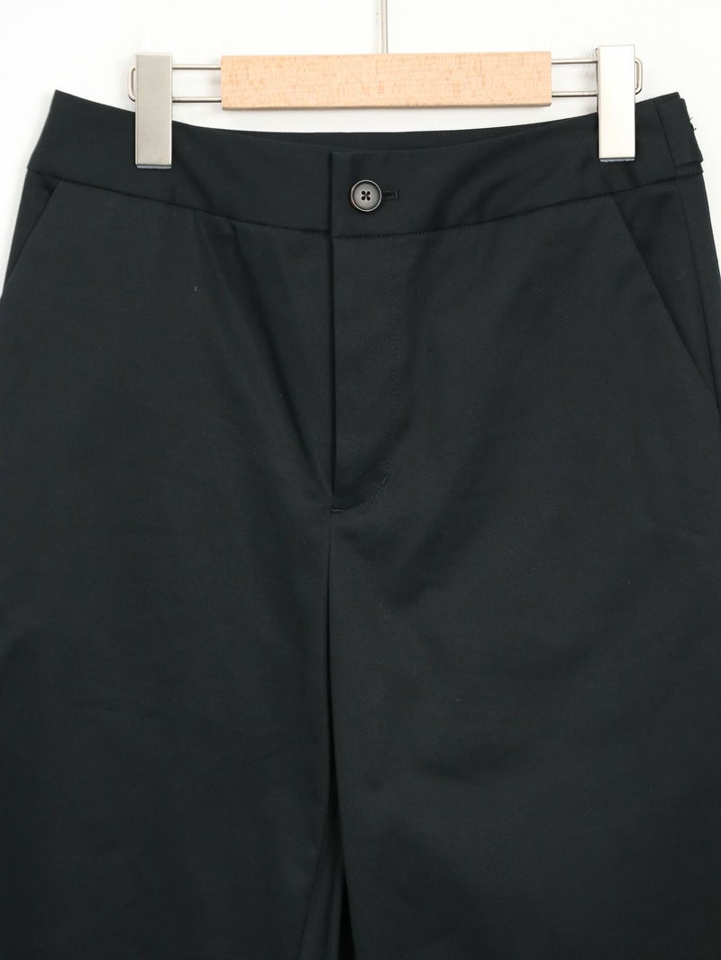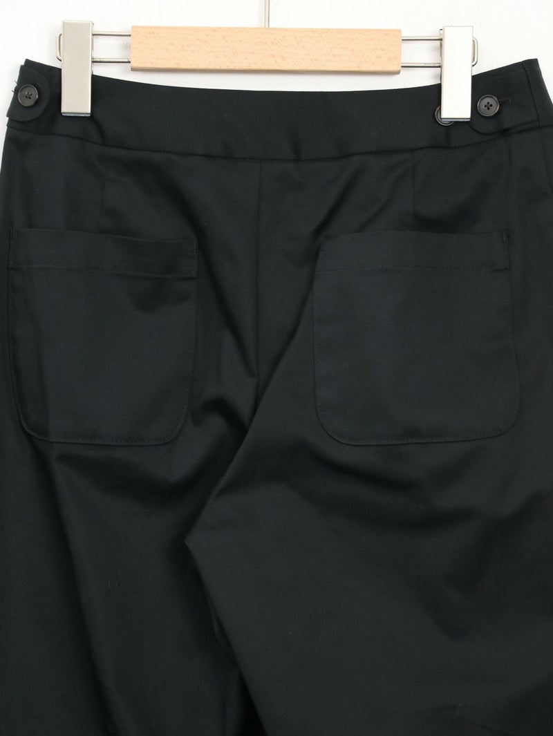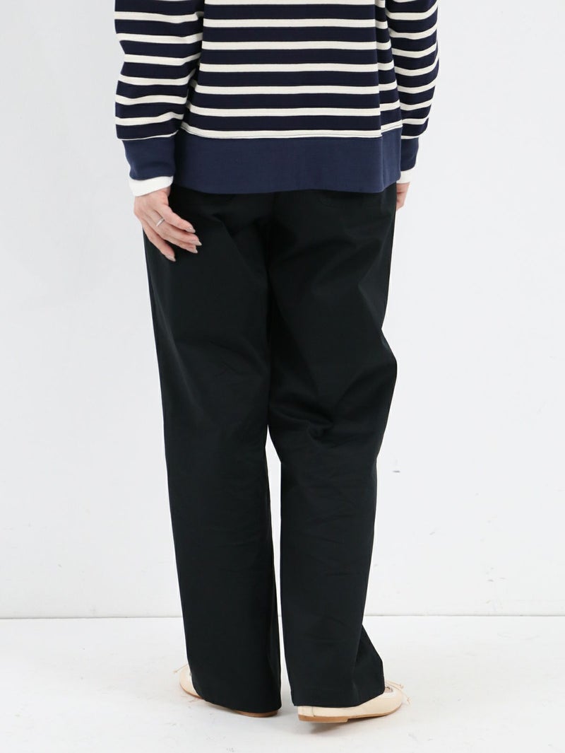糸ムラがなく均一で高級感のあるコーマツイルを使用したパンツ。 程よくゆとりのあるスッキリとしたシルエットでオフィスカジュアルにもオススメな一枚です。 ウエストサイドにサイズ調整用のボタンが付いており、片側3cmずつ調整が可能です。