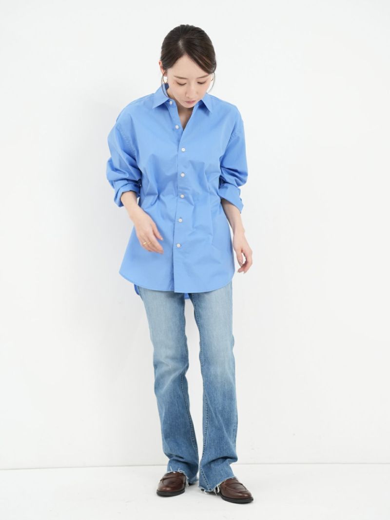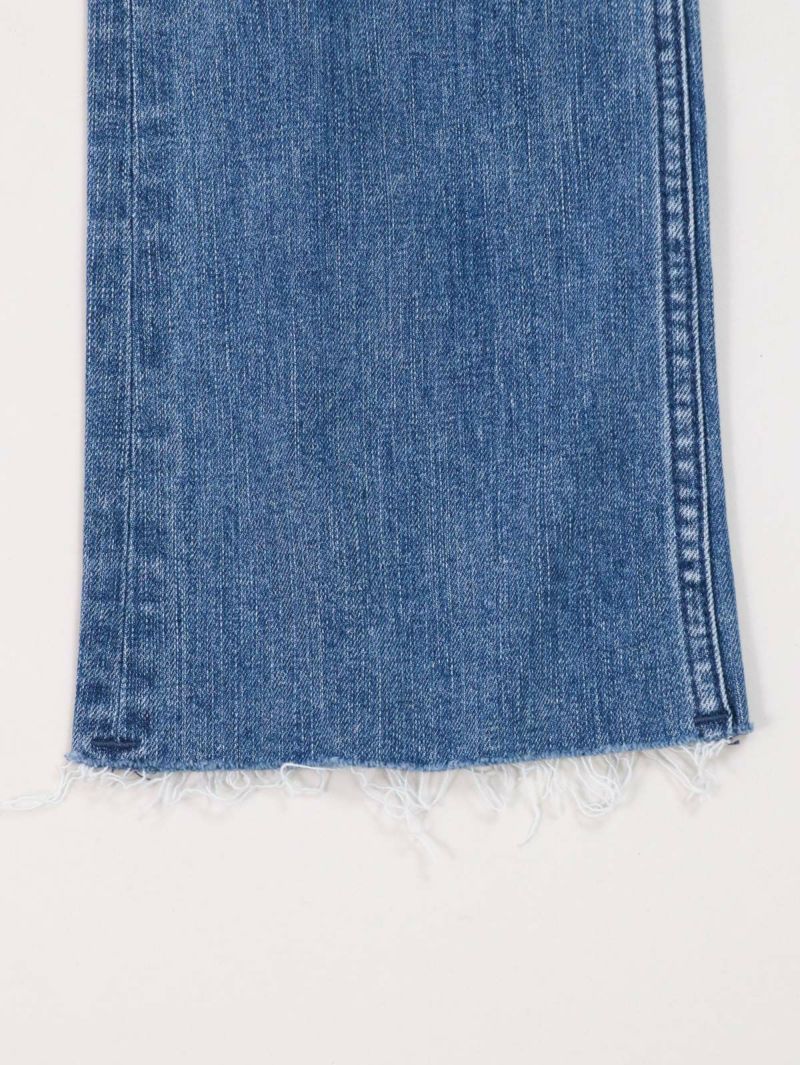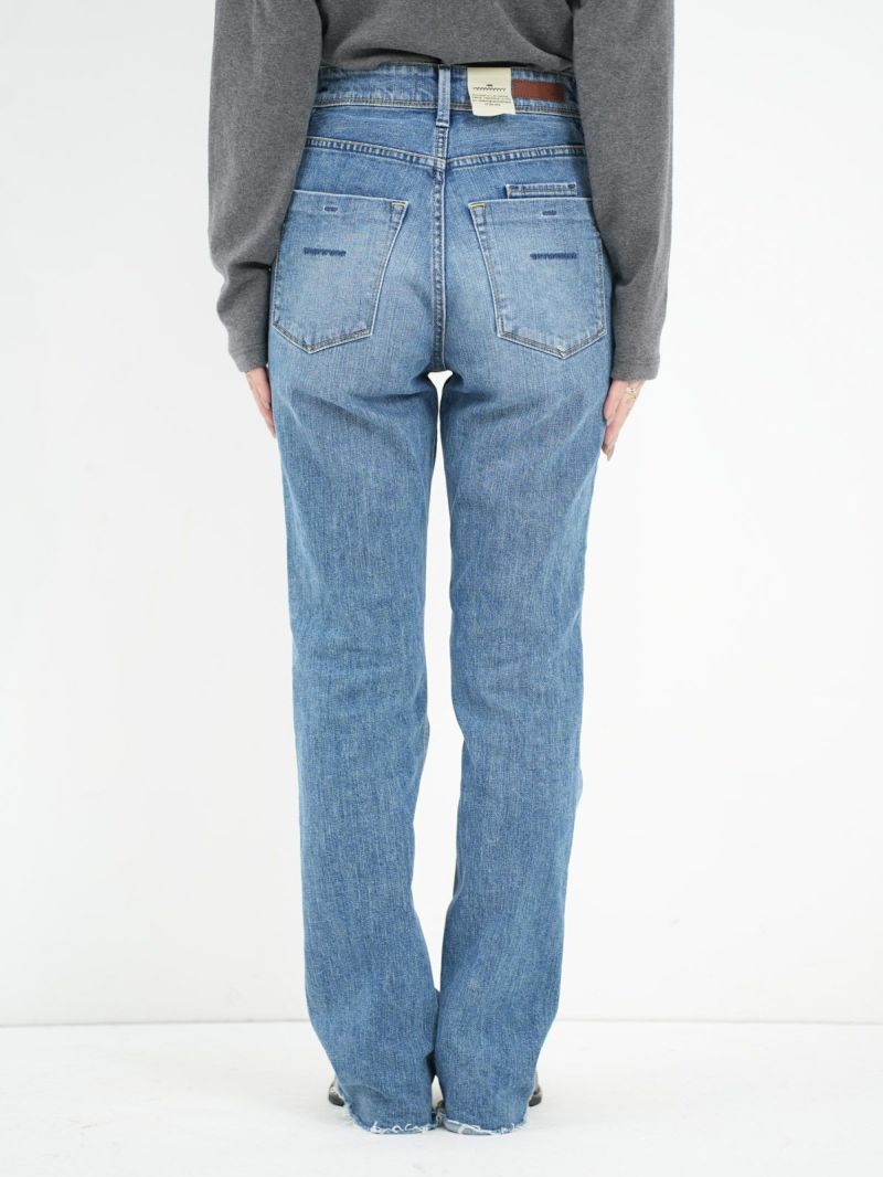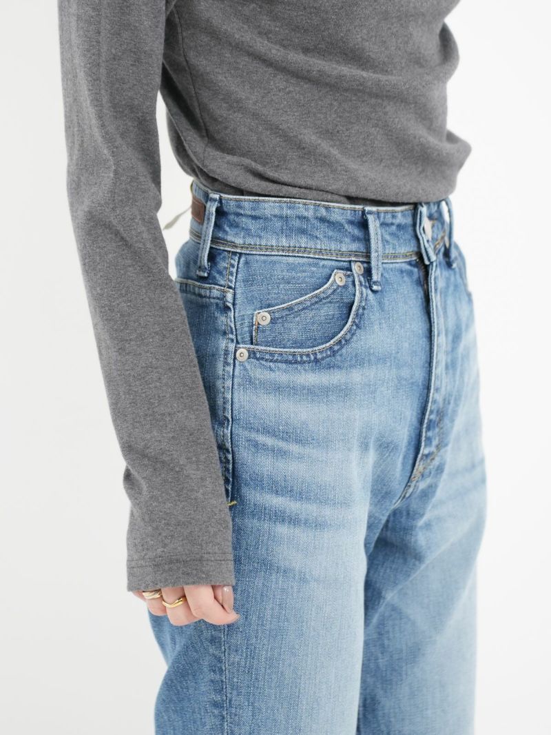 ハイウエストのセミフレア。 フレア感が抑えられており、ストレートに近いブーツカット。膝位置を高く設定することで高い膝位置から自然に広がるフレアが脚を長く見せてくれます。