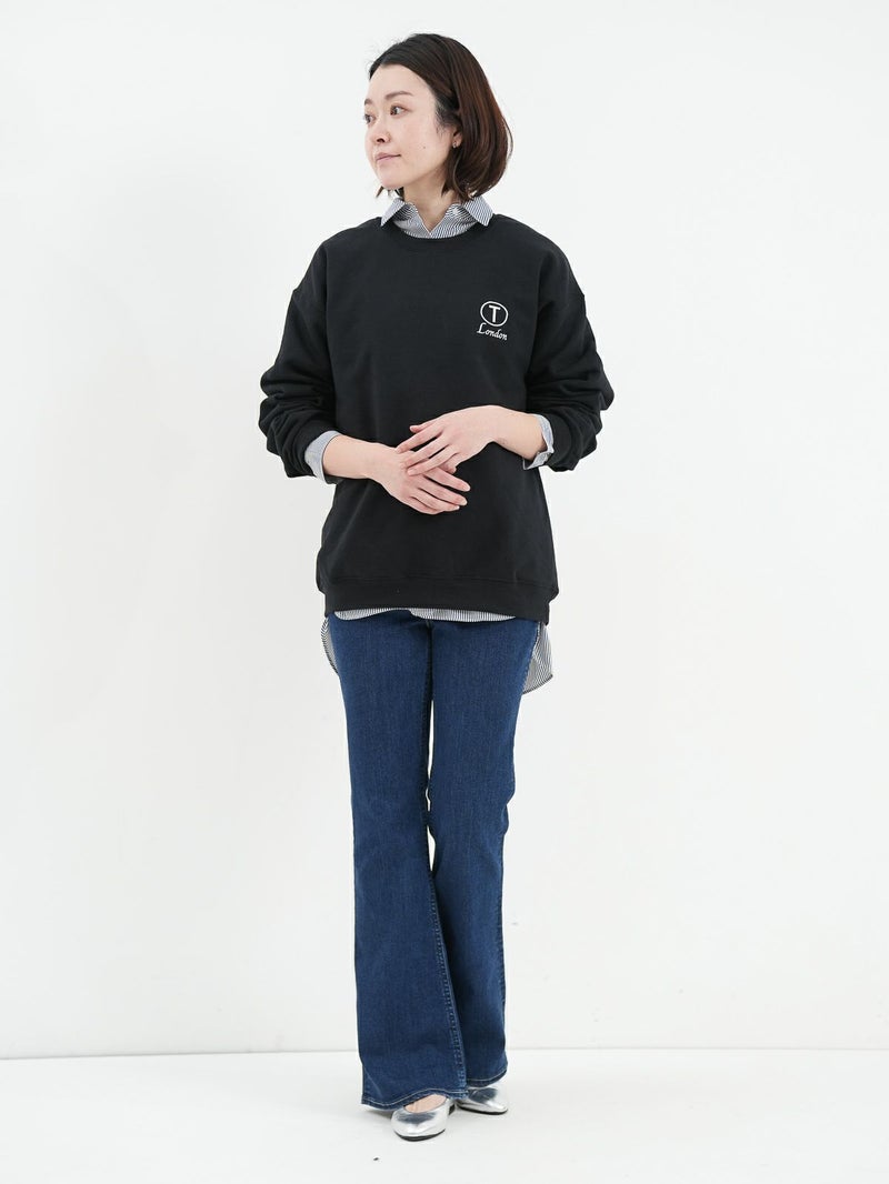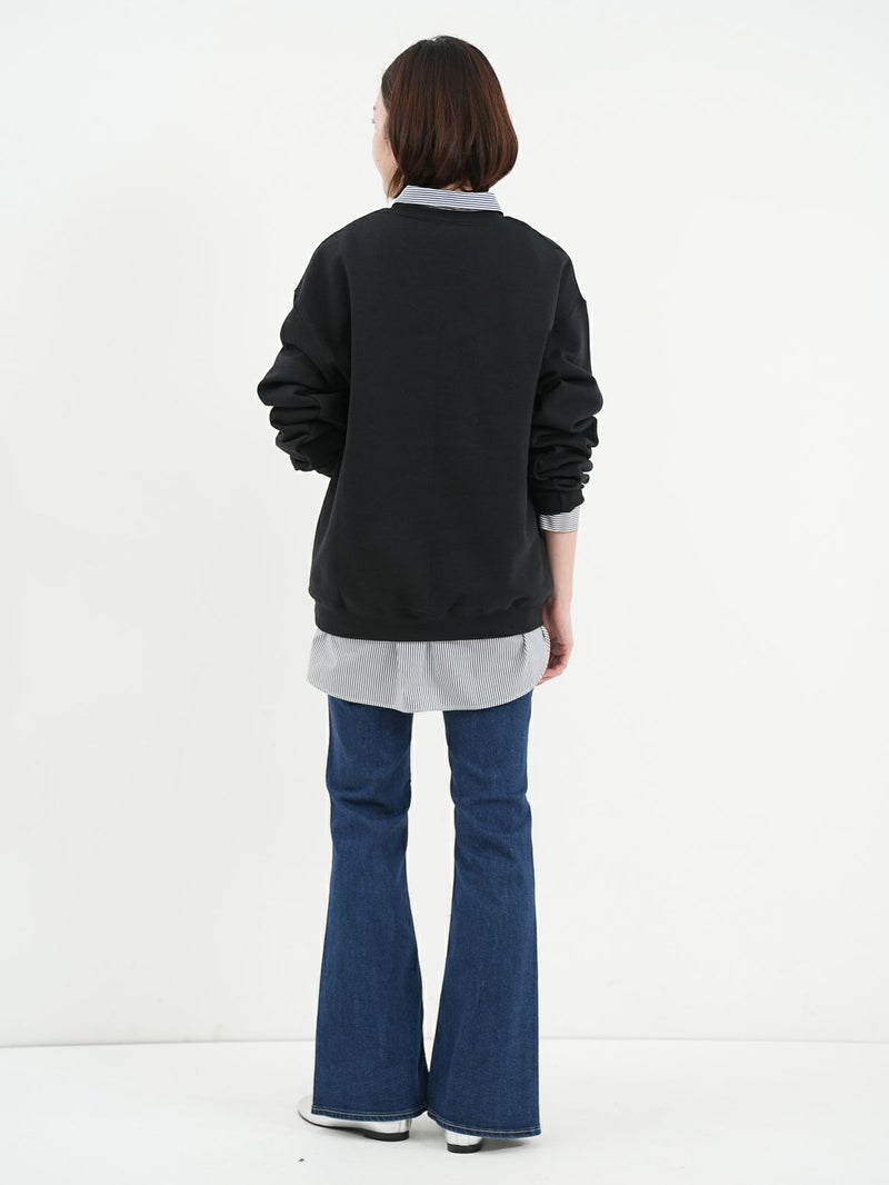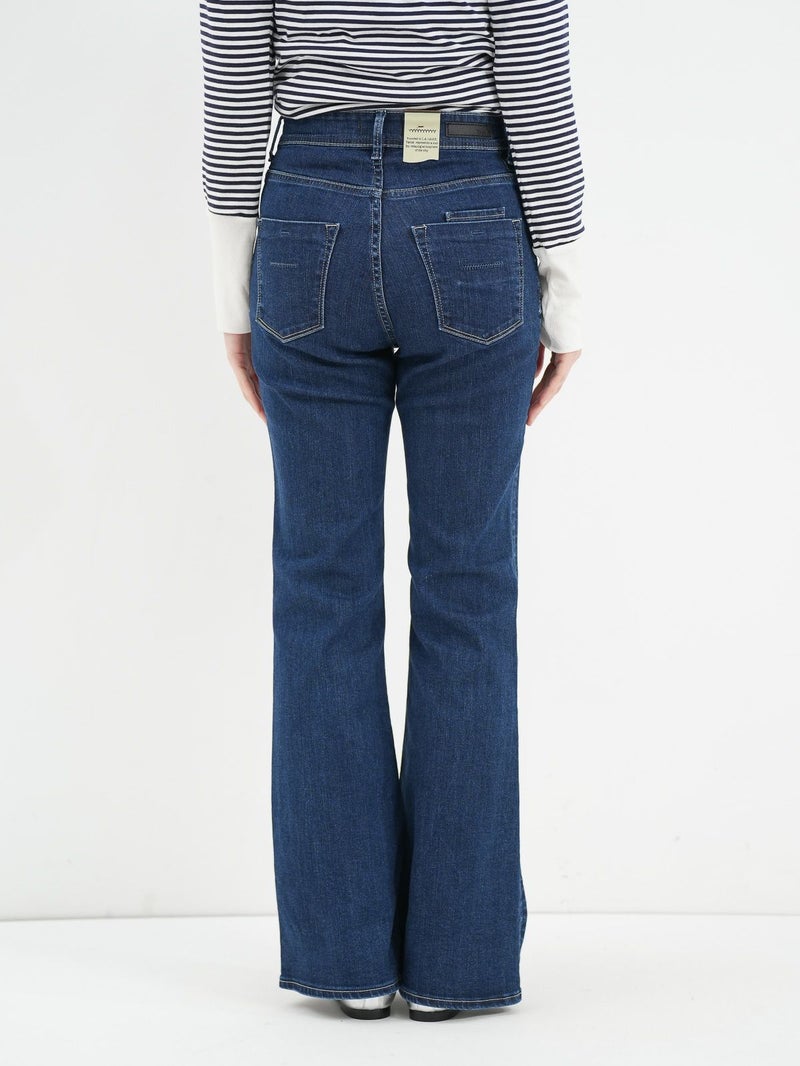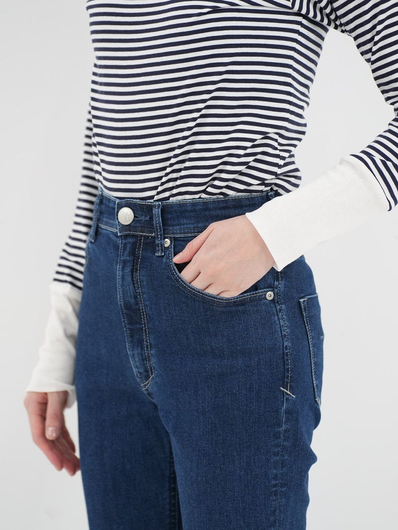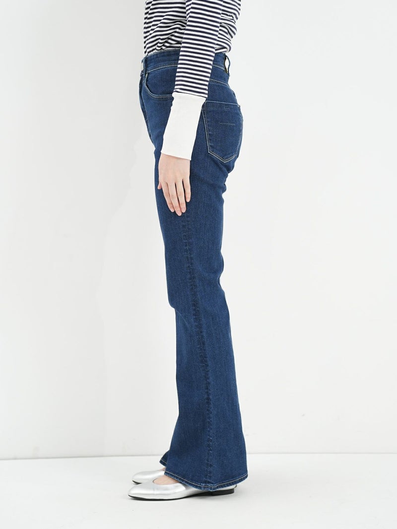 脚のラインをきれいに見せくれるブーツカットシルエットのデニム。 膝位置が高めなので、裾に向かってなだらかに広がるフレアラインが自然なスタイルアップを演出してくれます。ハイウエスト仕様で、トップスをインした着こなしもすっきり決まるのも◎