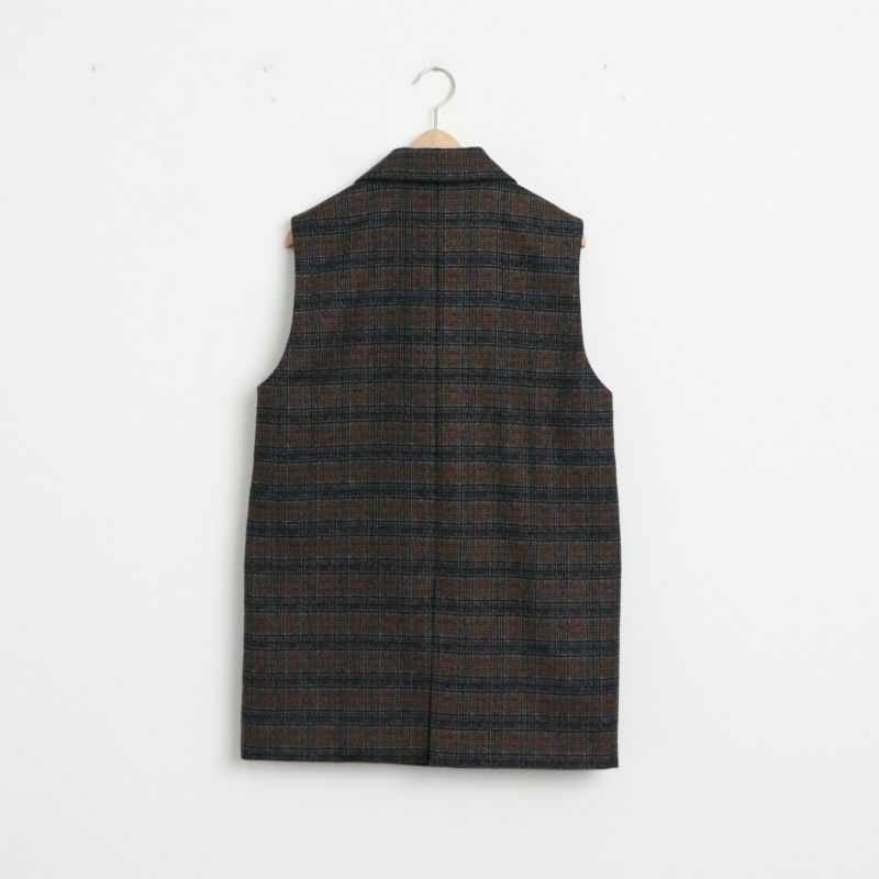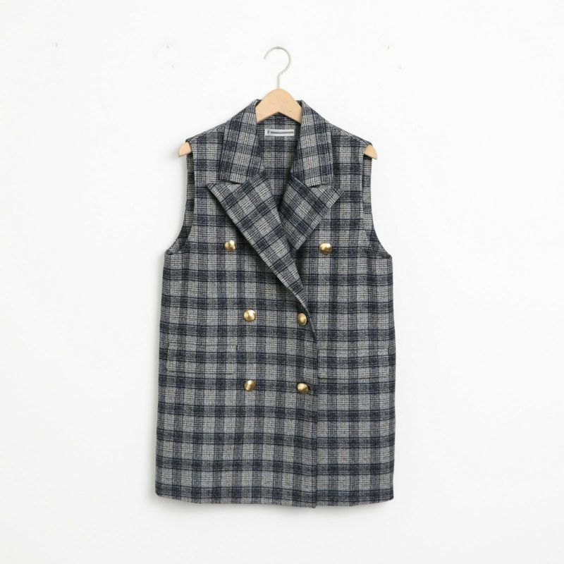 トレンド感のあるチェック柄生地を使用したジレ。 ダブルデザインと、ゴールドボタンでクラシカルな雰囲気に。 着丈が長めなシルエットは体型カバーができて、カットソーやブラウス、デニムにもあわせやすいプラスワンアイテム。