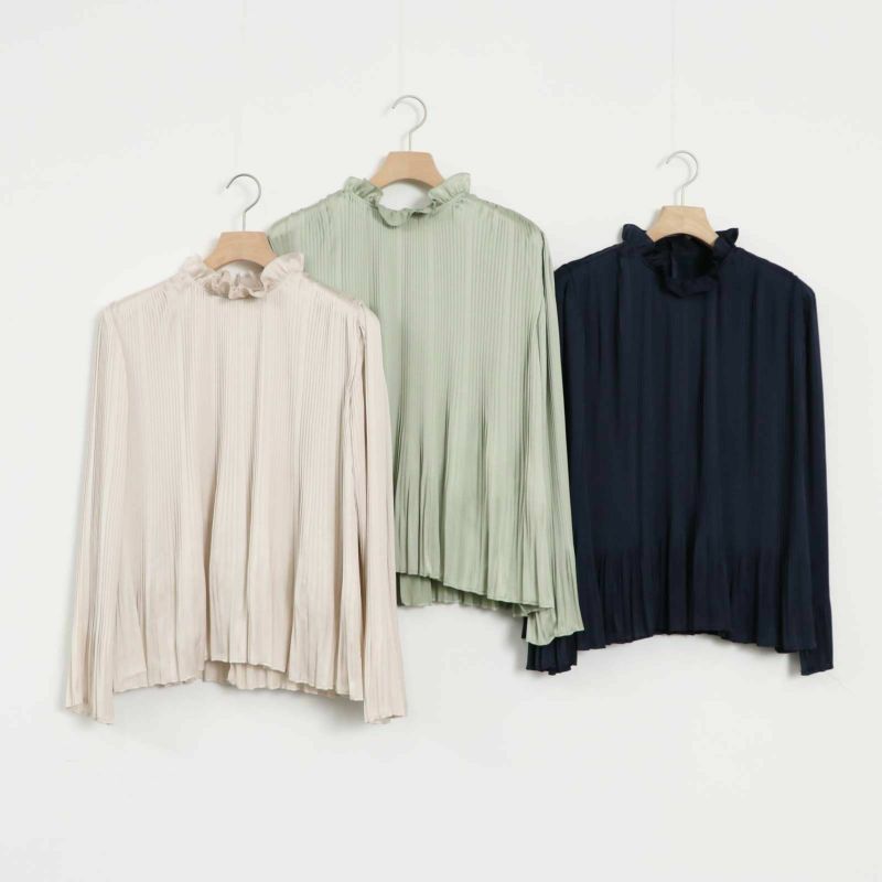 国内外の有名ブランドなどで活躍されているデザイナーからも支持されている福岡のプリーツ専門メーカーオザキプリーツで生産したアイテム。 華やかな光沢感とソフトな風合いが上品なプリーツブラウスです。同素材でスカート(BD_FK24S-020)も作っているため、セットアップでの着用がオススメです。オケージョンシーンでもお召いただけます。