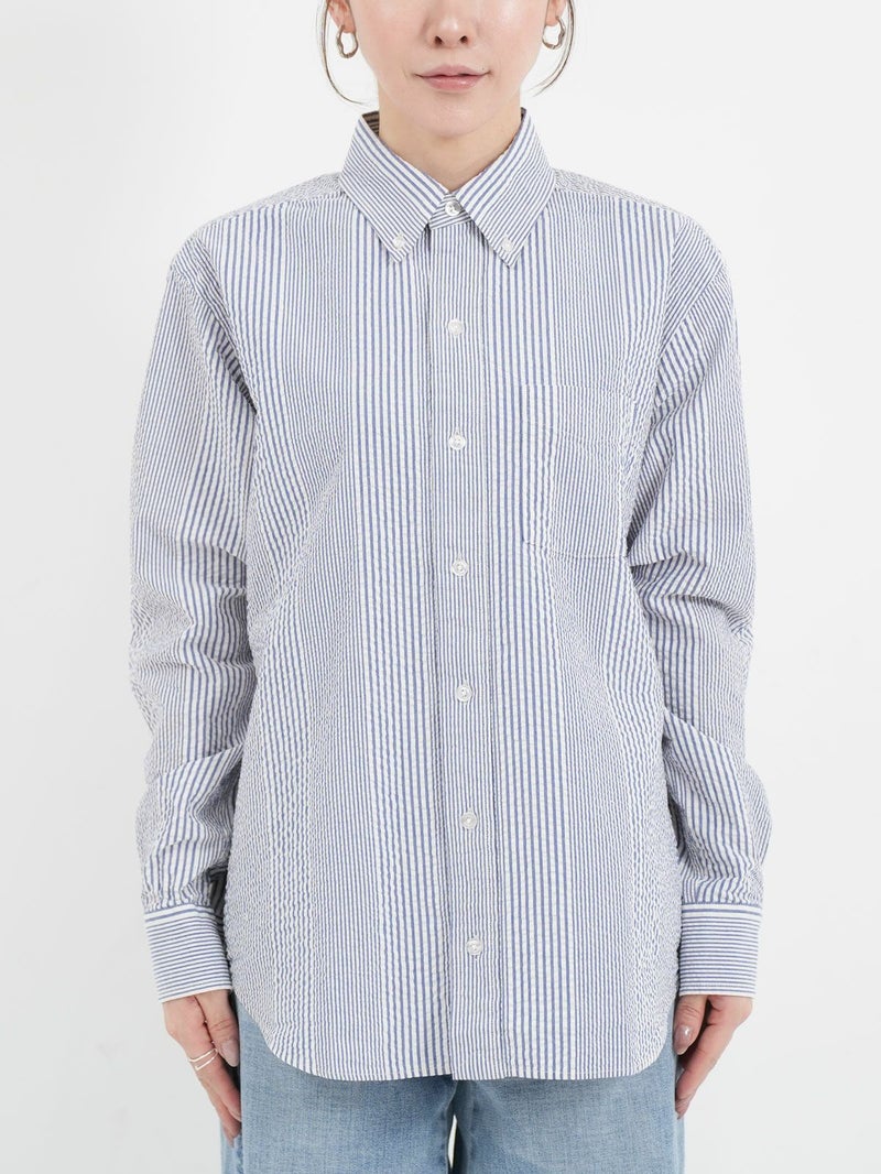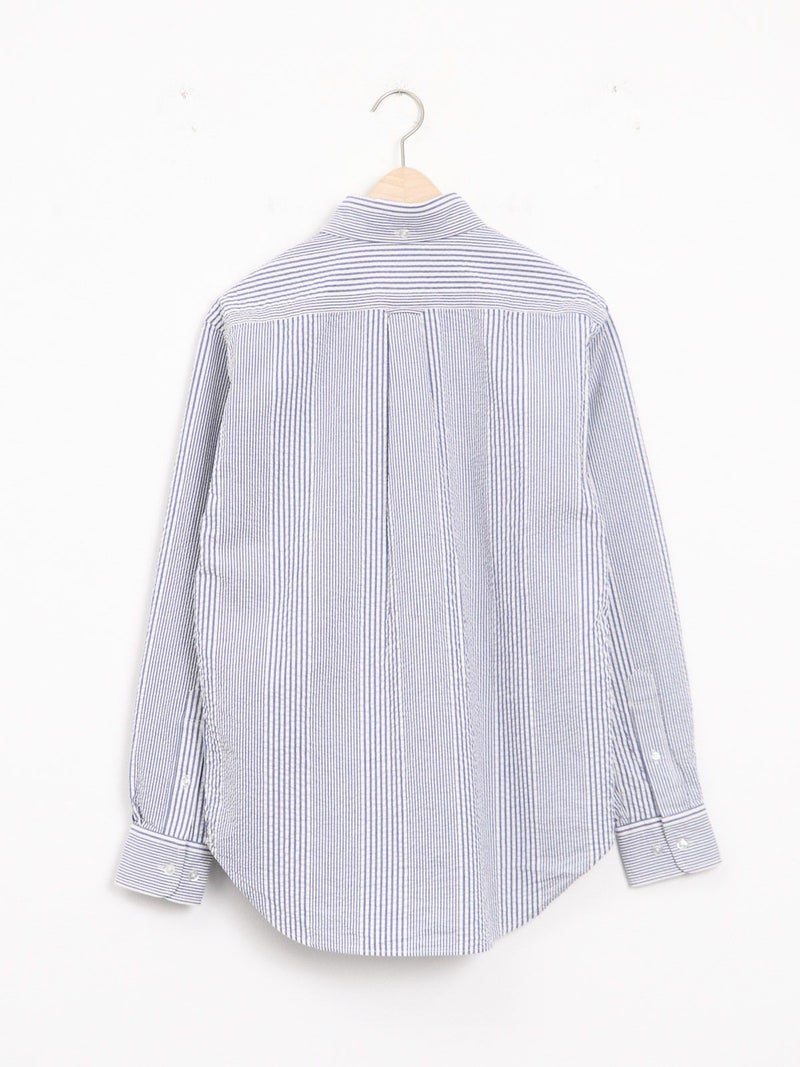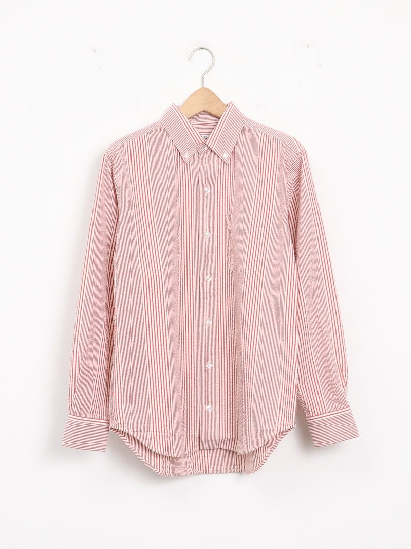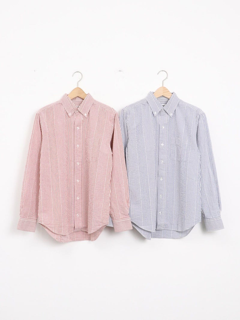 肌触りが涼しげなシアサッカーBDストライプシャツ。 ブルーとレッドの夏カラーでスカートにもパンツにも映えるコーディネートが完成します。ワンポイントにも紫外線よけや冷房対策の羽織にも活躍できる1枚!夏はショートパンツにサンダルもオススメです。