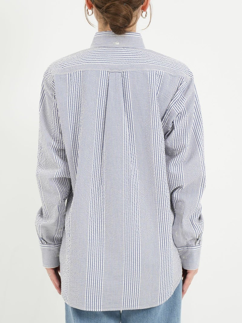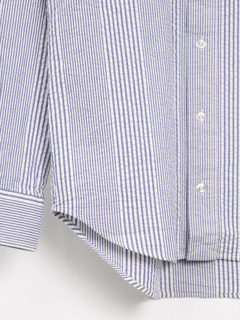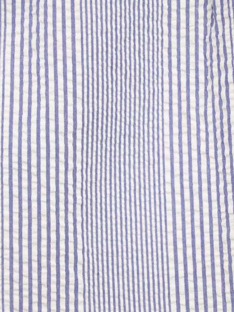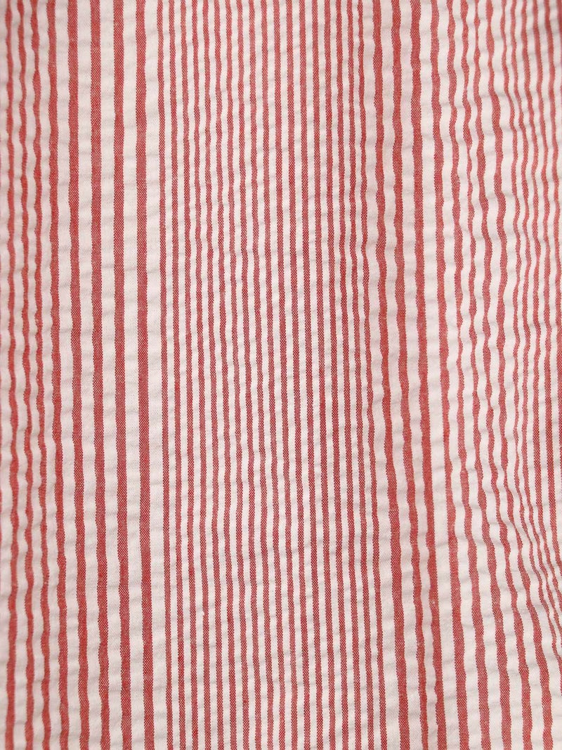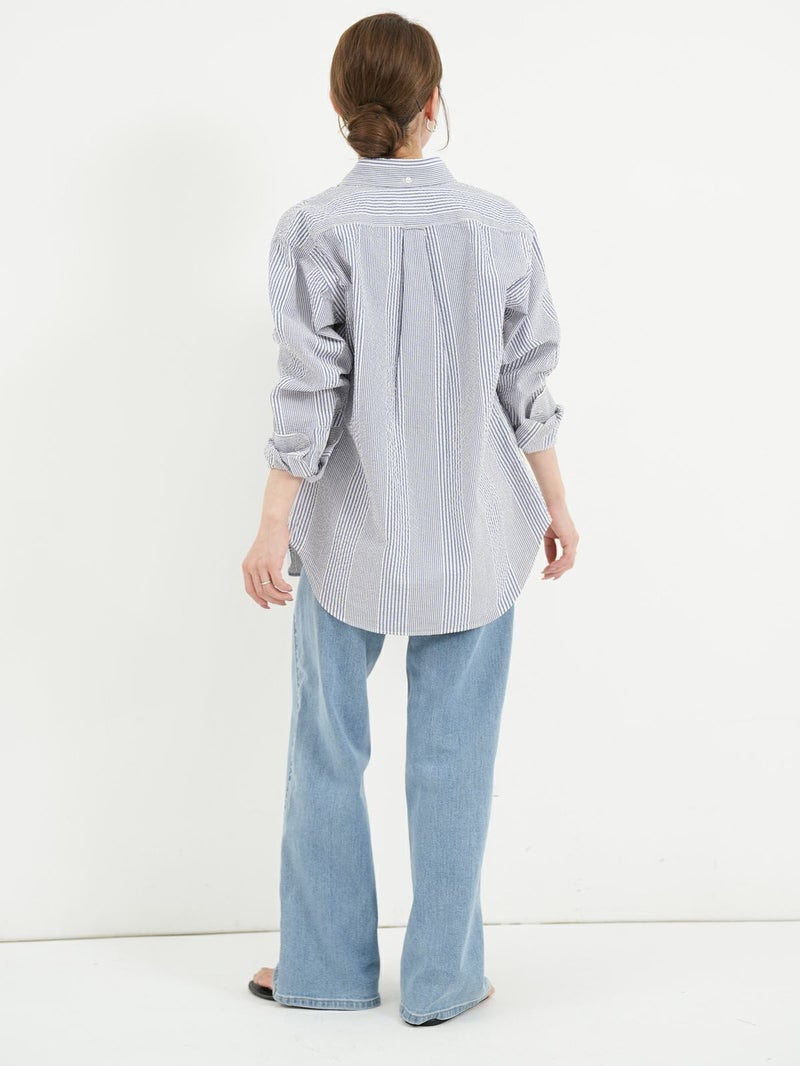 肌触りが涼しげなシアサッカーBDストライプシャツ。 ブルーとレッドの夏カラーでスカートにもパンツにも映えるコーディネートが完成します。ワンポイントにも紫外線よけや冷房対策の羽織にも活躍できる1枚!夏はショートパンツにサンダルもオススメです。