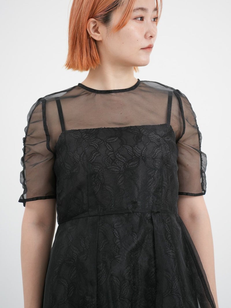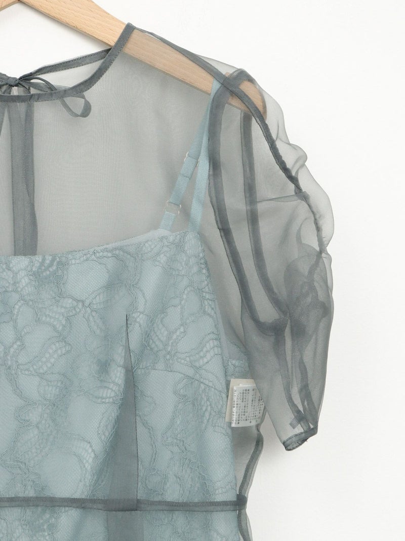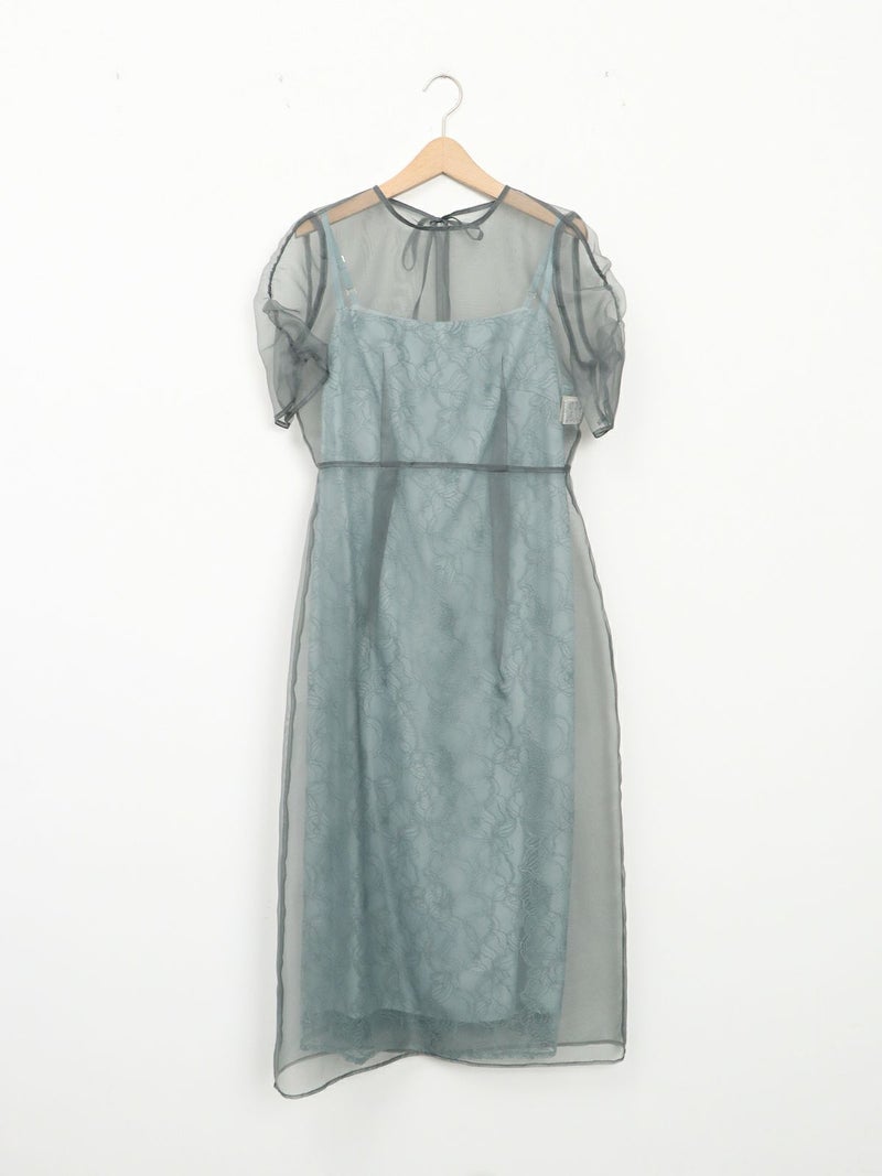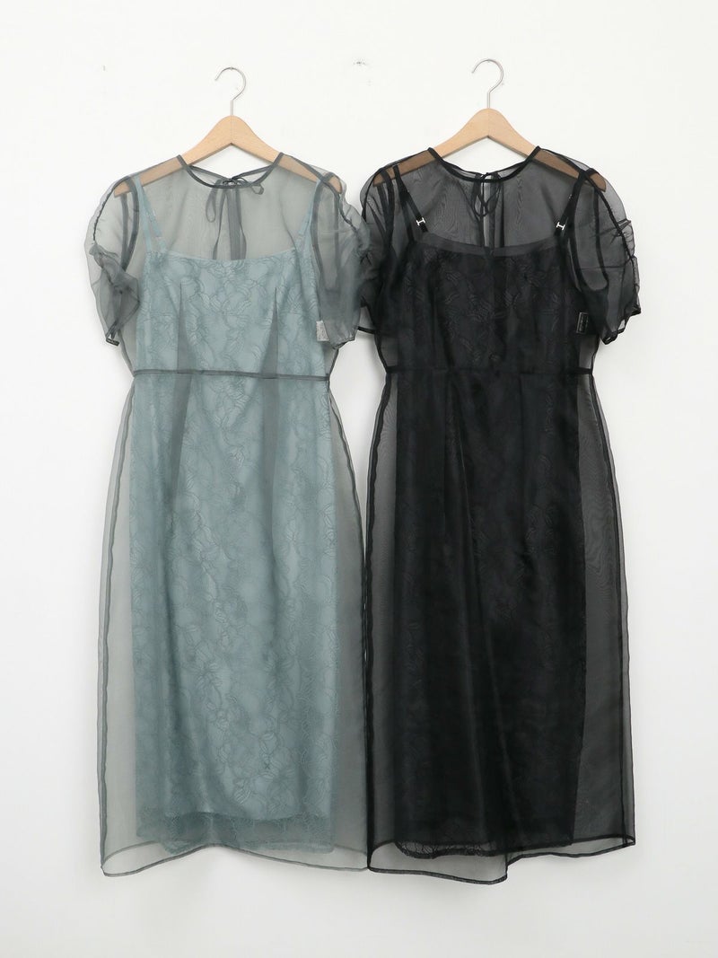 レースでデザインしたインナーの上に、オーガンジーのエプロンドレスを重ねた、レイヤードドレス。 インナードレスのレースがオーガンジー越しに透けて見え、またそれぞれ微妙に異なる配色のコントラストが遊び心のあるデザインです。 トレンド感のあるエアリーな生地感と、肌映りの良い優しいくすみカラーもポイント。 結婚式や二次会パーティーなどのお呼ばれドレスにおすすめです。