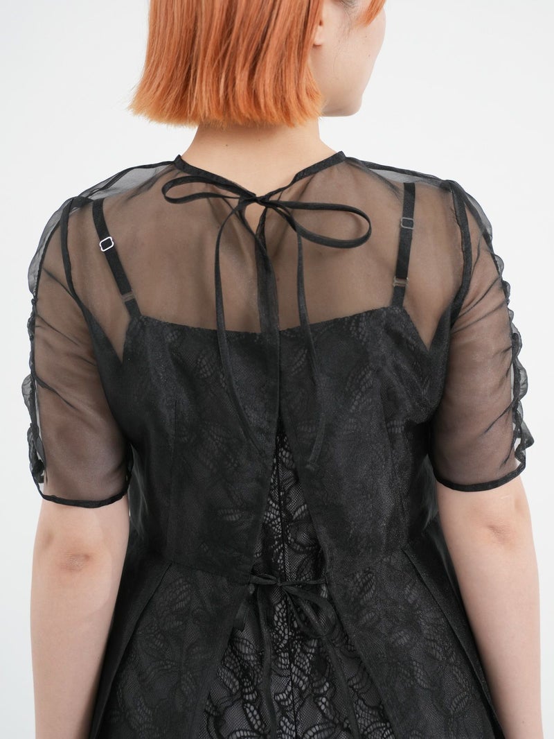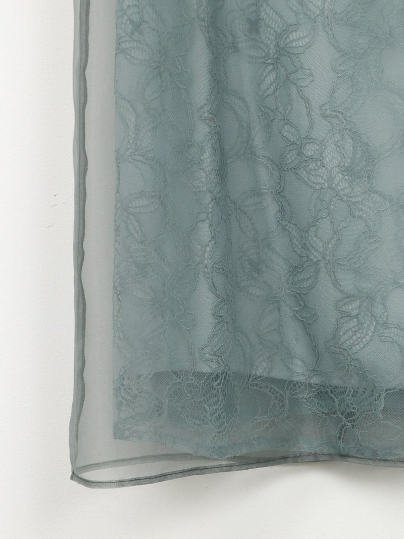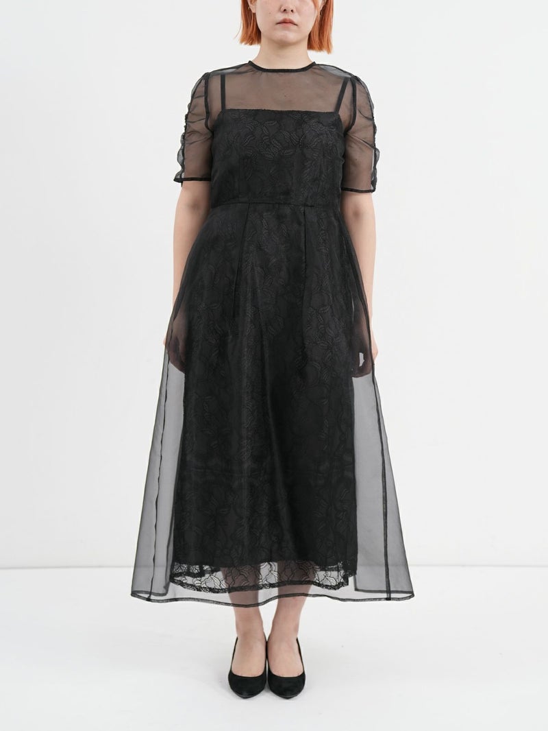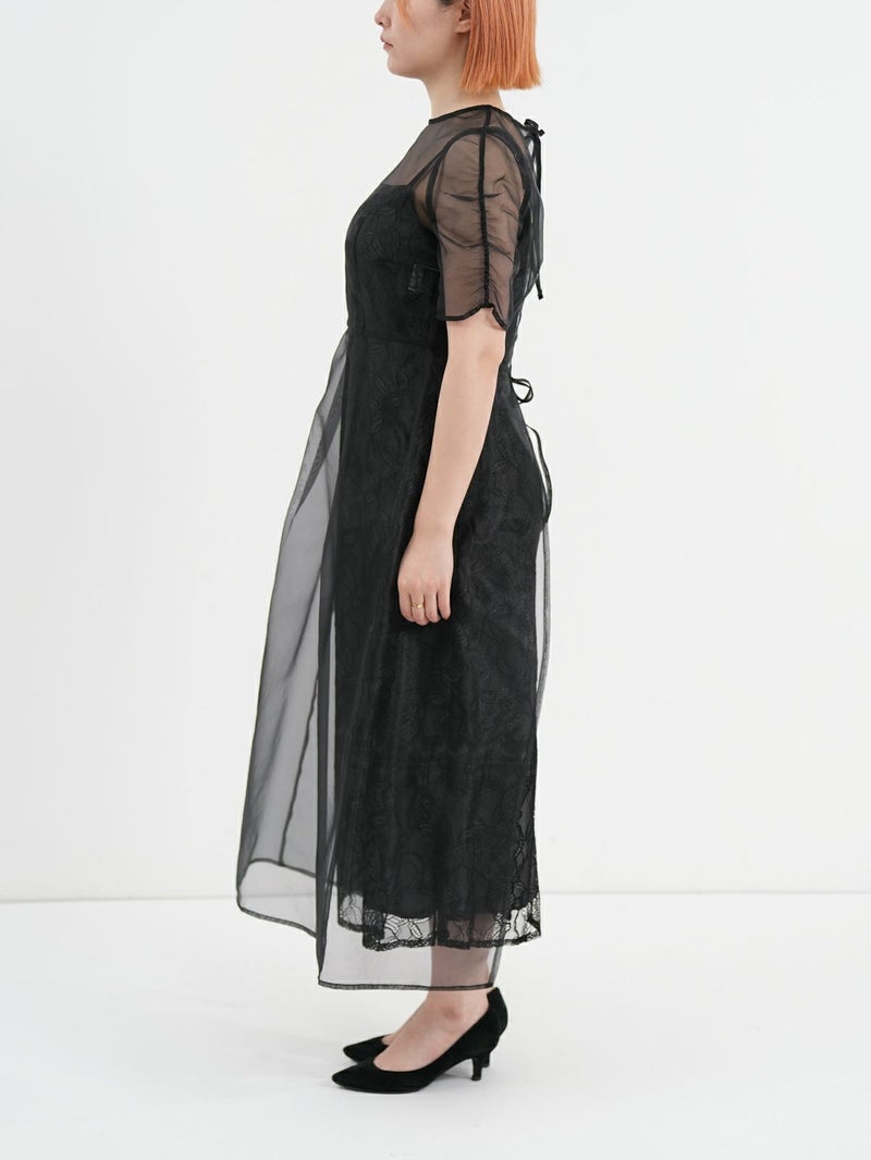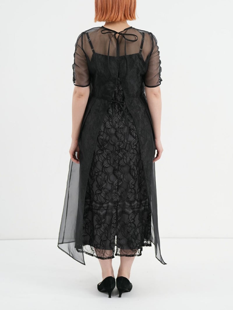 レースでデザインしたインナーの上に、オーガンジーのエプロンドレスを重ねた、レイヤードドレス。 インナードレスのレースがオーガンジー越しに透けて見え、またそれぞれ微妙に異なる配色のコントラストが遊び心のあるデザインです。 トレンド感のあるエアリーな生地感と、肌映りの良い優しいくすみカラーもポイント。 結婚式や二次会パーティーなどのお呼ばれドレスにおすすめです。