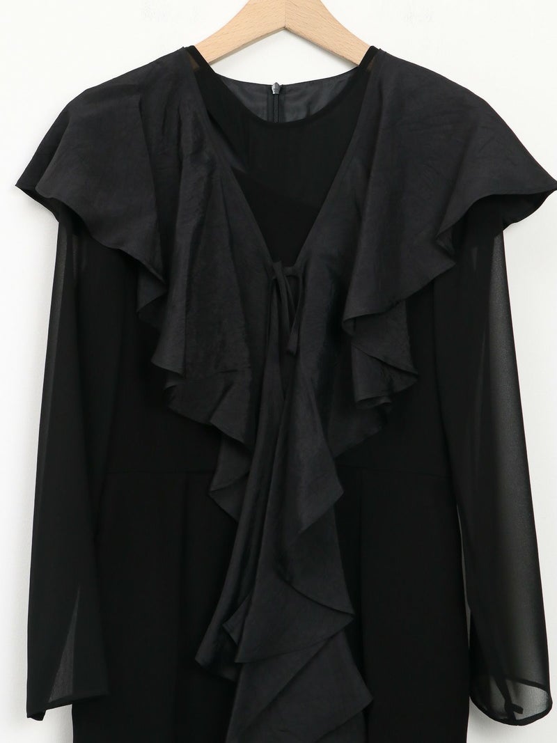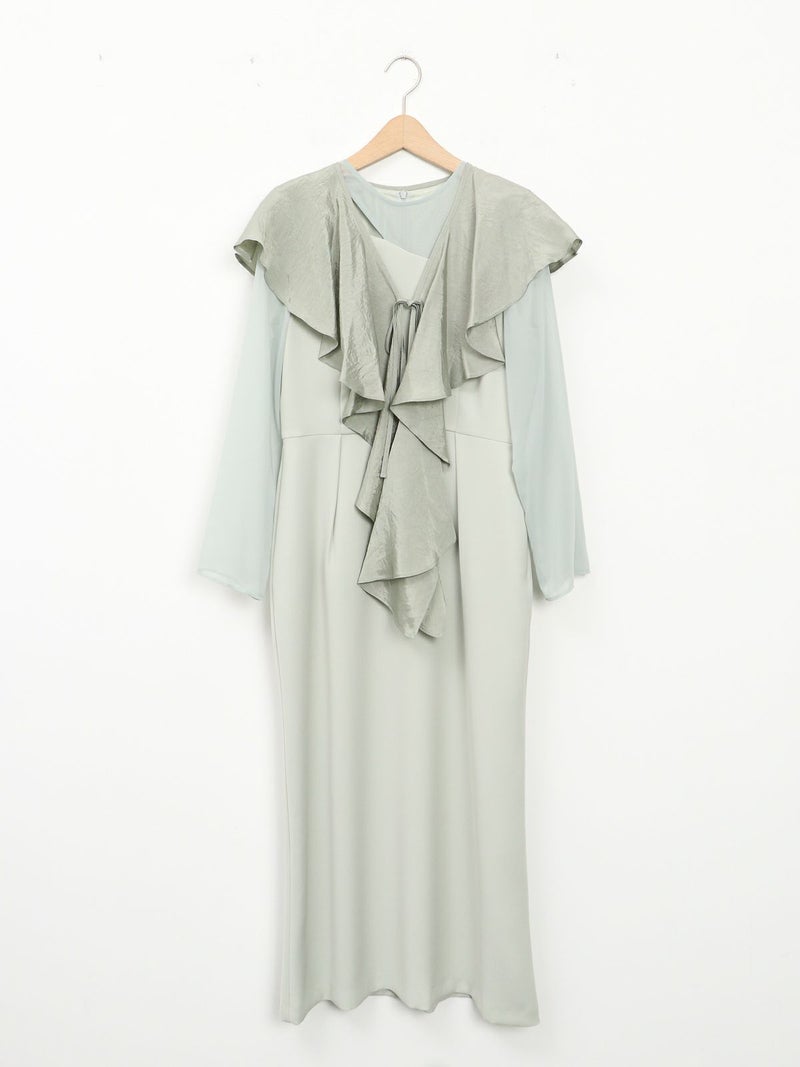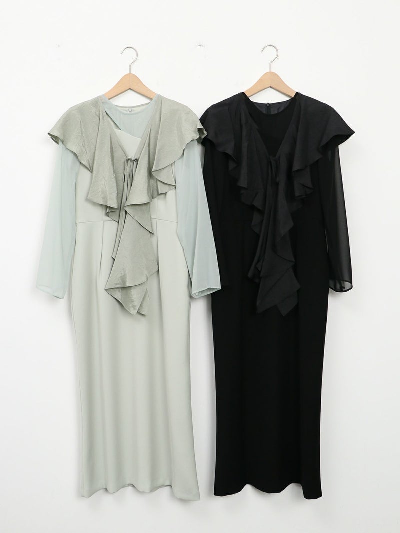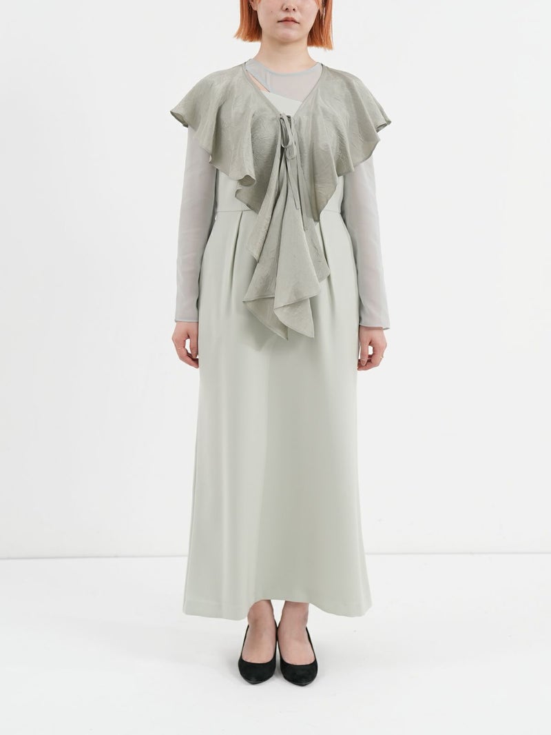 モードな切替えとレディなラッフルショールの合わせが印象的なセットドレス。 フレアーショールのバリエーションで最大5タイプの着用法が可能。 モードな斜めかけスタイルに、またウエストに巻いてペプラム風に…気分によって印象を変えることができます。 またショールを付けずに、ドレスのみで衿のカッティングを印象づけるスタイルもオススメ。 ドレスのマーメイドシルエットは身体のラインを綺麗にみせ、高めの胸下切替えでスタイルアップ効果もあります。