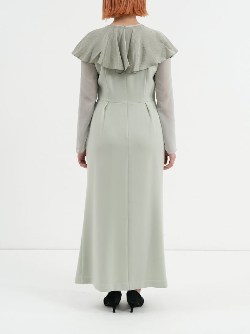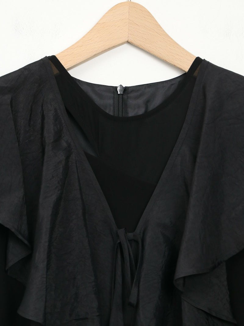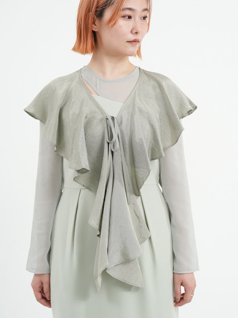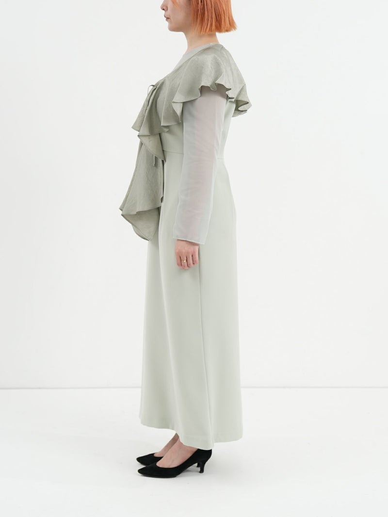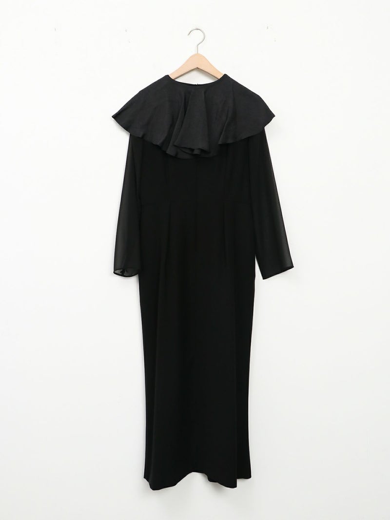 モードな切替えとレディなラッフルショールの合わせが印象的なセットドレス。 フレアーショールのバリエーションで最大5タイプの着用法が可能。 モードな斜めかけスタイルに、またウエストに巻いてペプラム風に…気分によって印象を変えることができます。 またショールを付けずに、ドレスのみで衿のカッティングを印象づけるスタイルもオススメ。 ドレスのマーメイドシルエットは身体のラインを綺麗にみせ、高めの胸下切替えでスタイルアップ効果もあります。