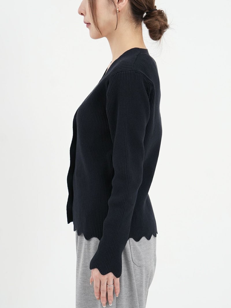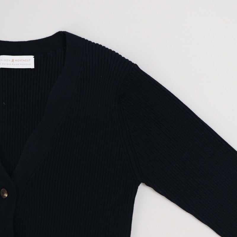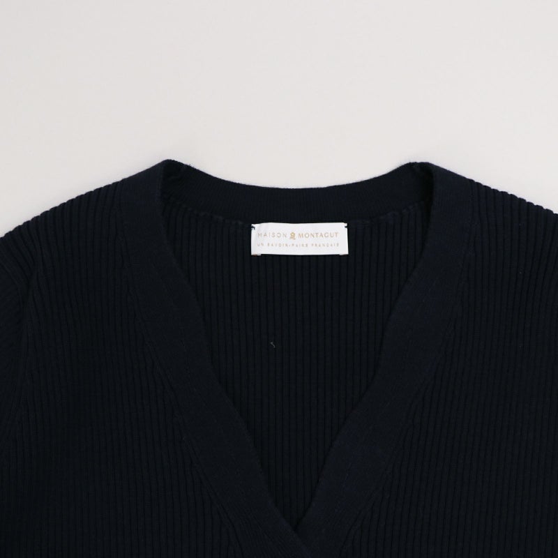 MAISON MONTAGUTのVネックカーディガン。 工房で丁寧に編まれたカーディガンは、エレガントなシルエットとデザインが特徴。 高品質のテクニカルコットンを使用し、快適さと耐久性を兼ね備えています。