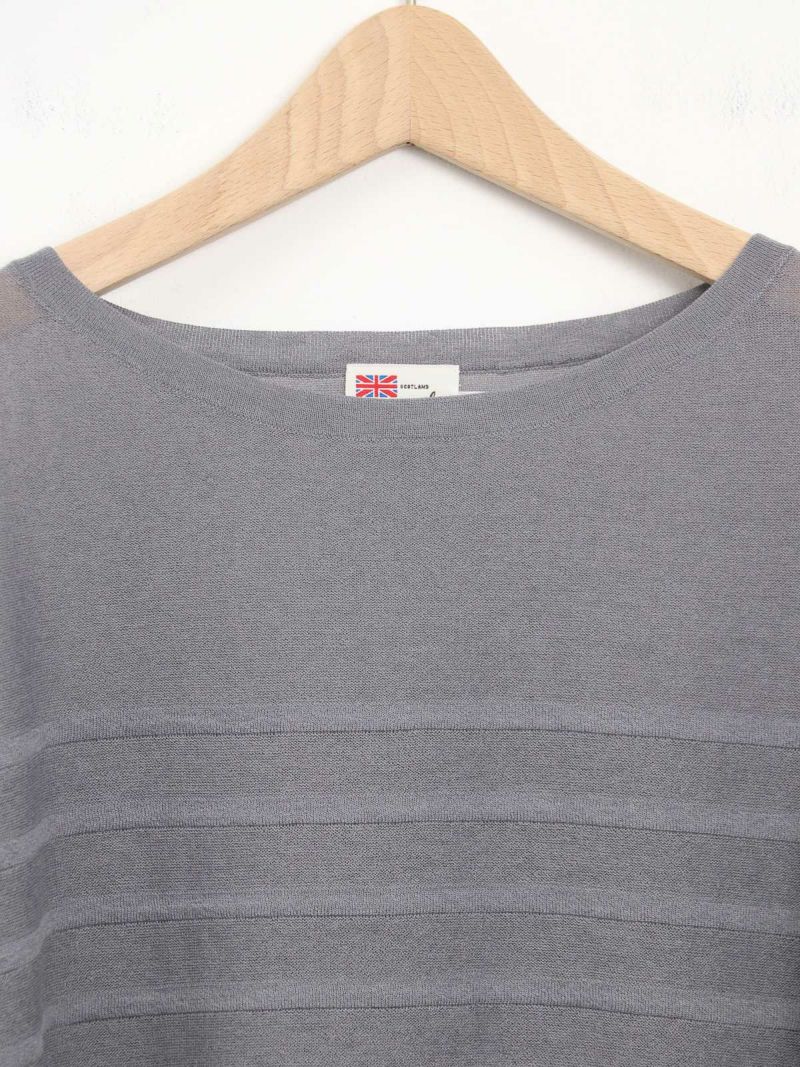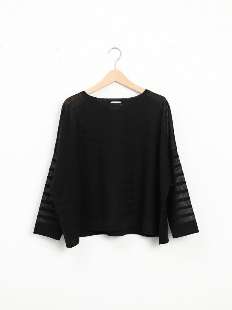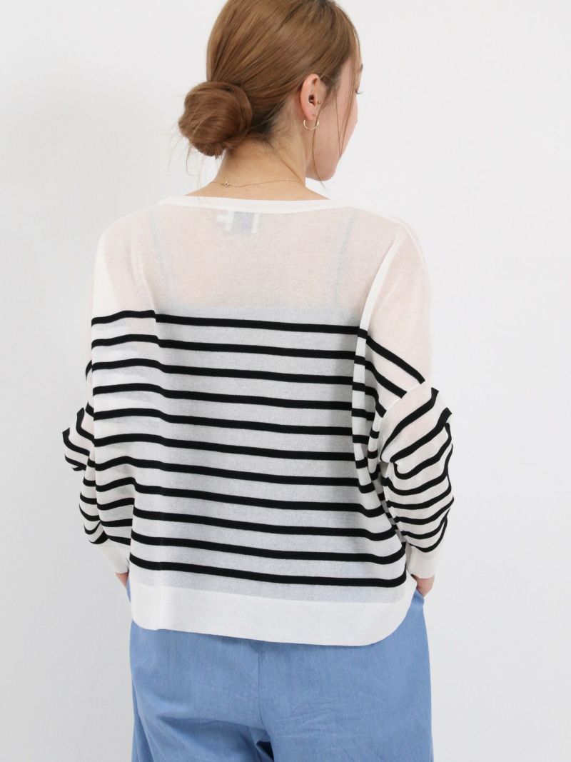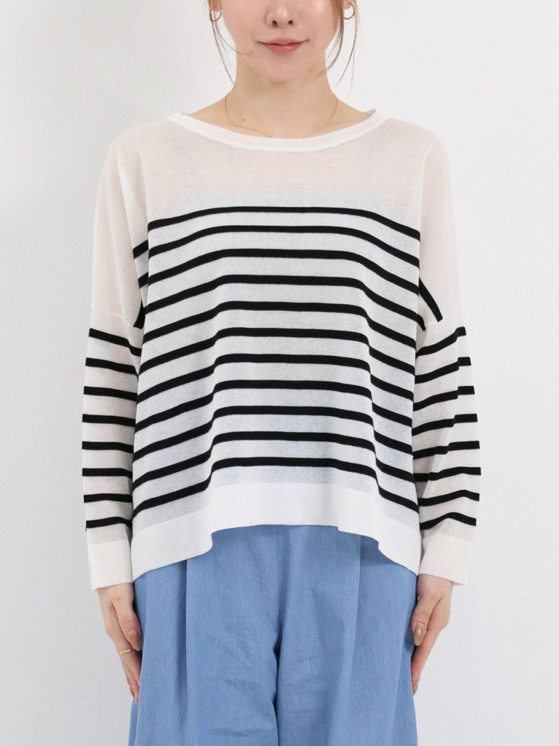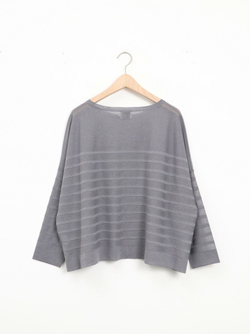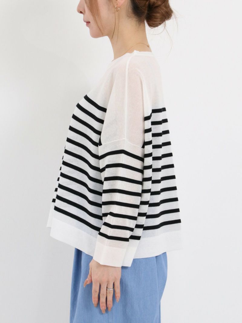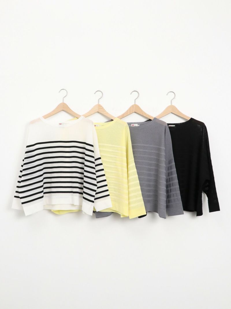 シアーニット素材でドライな手触りが特徴のLYNE KNIT。 ブランド独自のドロップショルダーとゆったりとしたAラインのシルエットが魅力です。コンパクトな丈感でパンツにもスカートにも合わせやすく着回し力抜群のアイテムです。