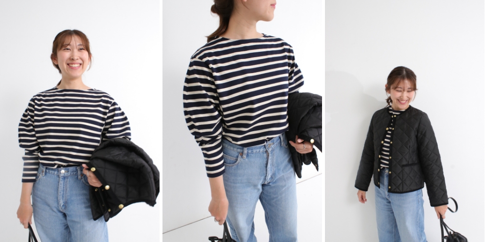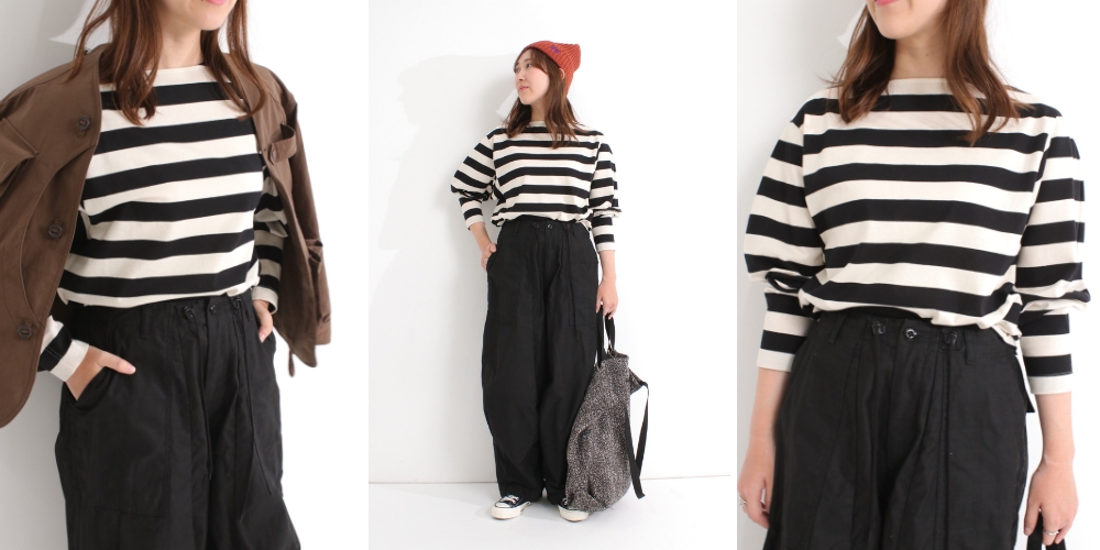 太めのボーダーは存在感があり、コーディネートで主役のインパクトを与えてくれます。いつものボーダーもパフのデザインで女性らしい雰囲気を演出。