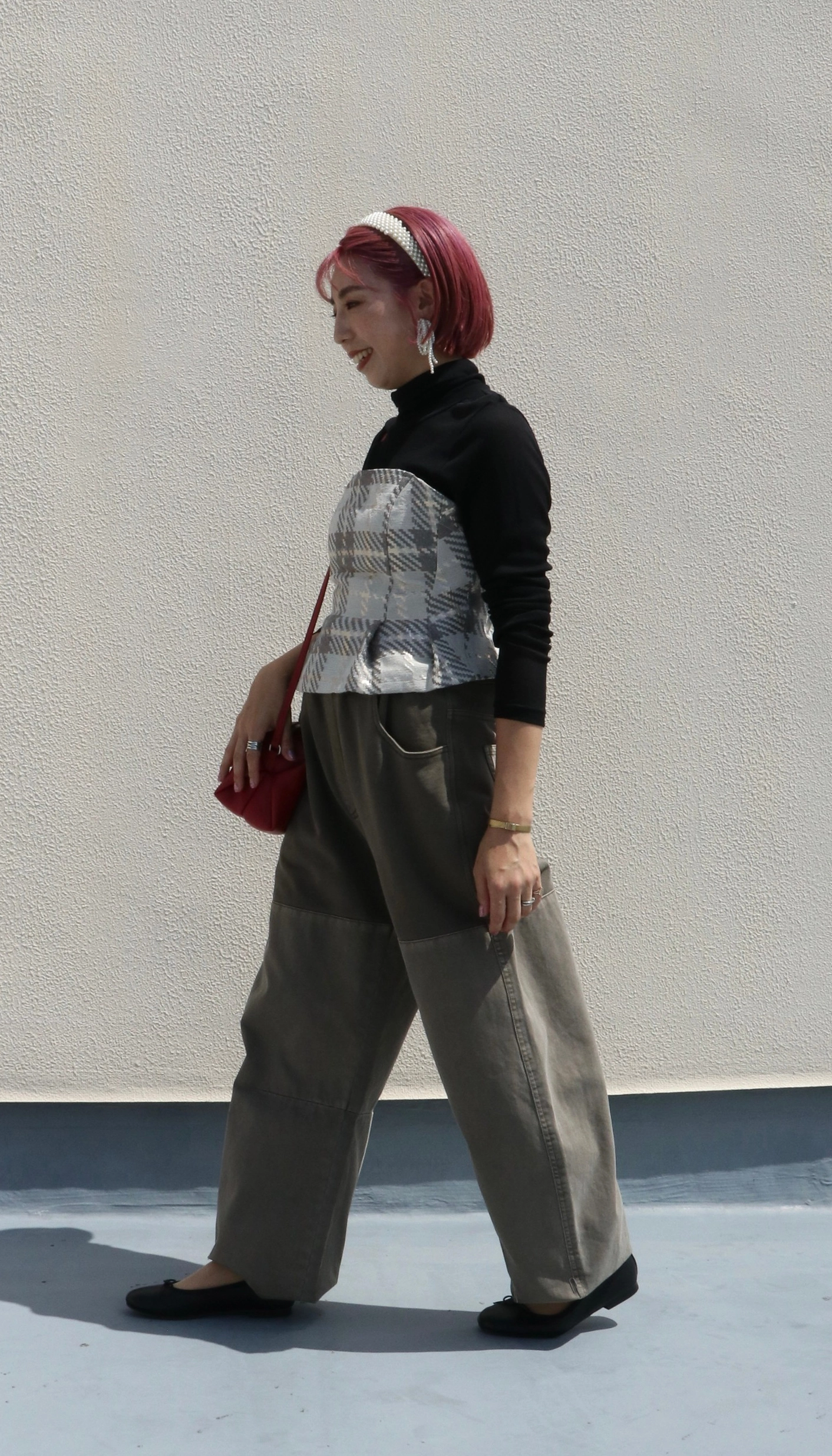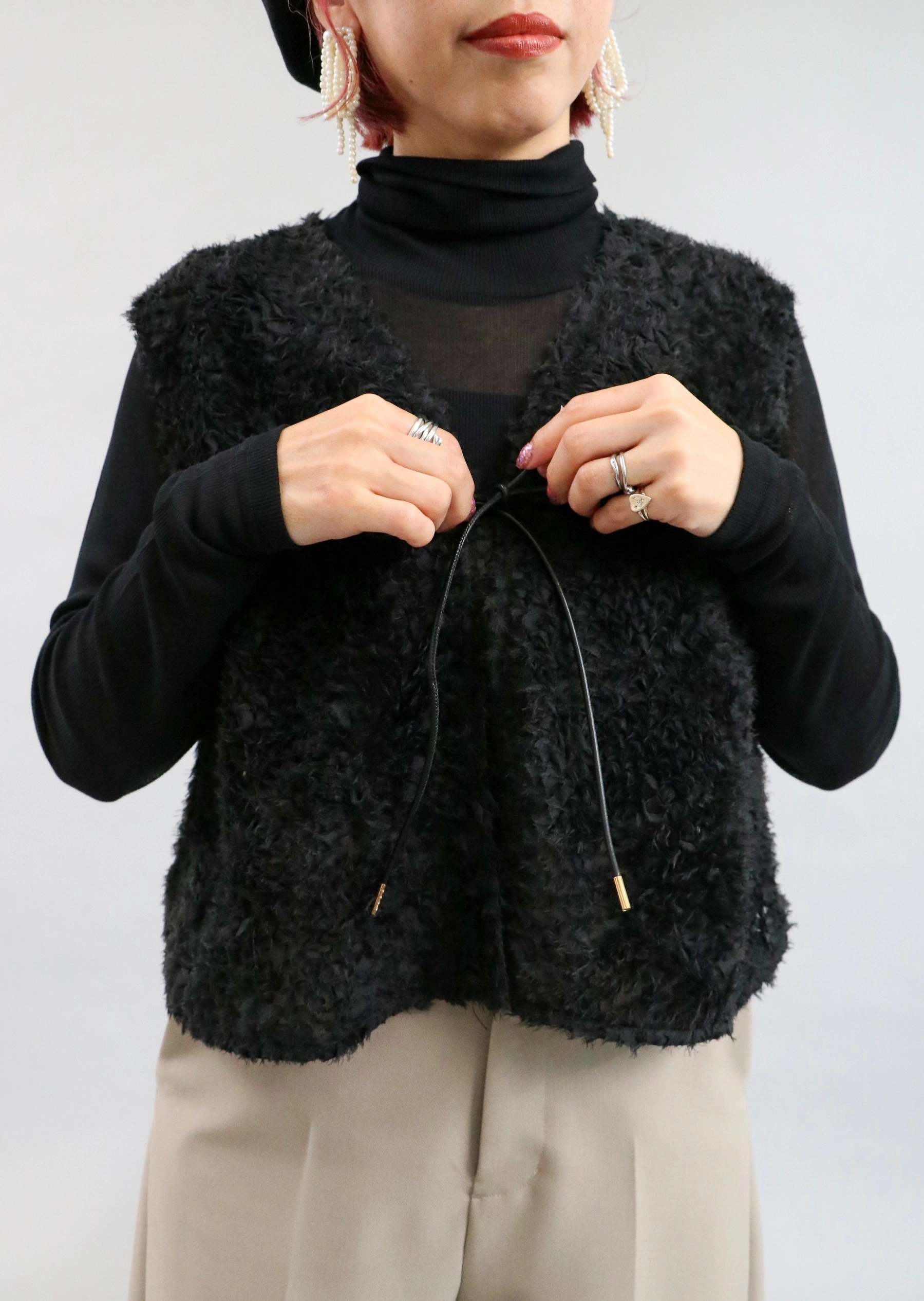 重厚感のあるジャガードビスチェを主役に、丸みのあるコクーンパンツで抜け感をプラス。 華やかさとリラックス感がいつもと違う新鮮なスタイルに。