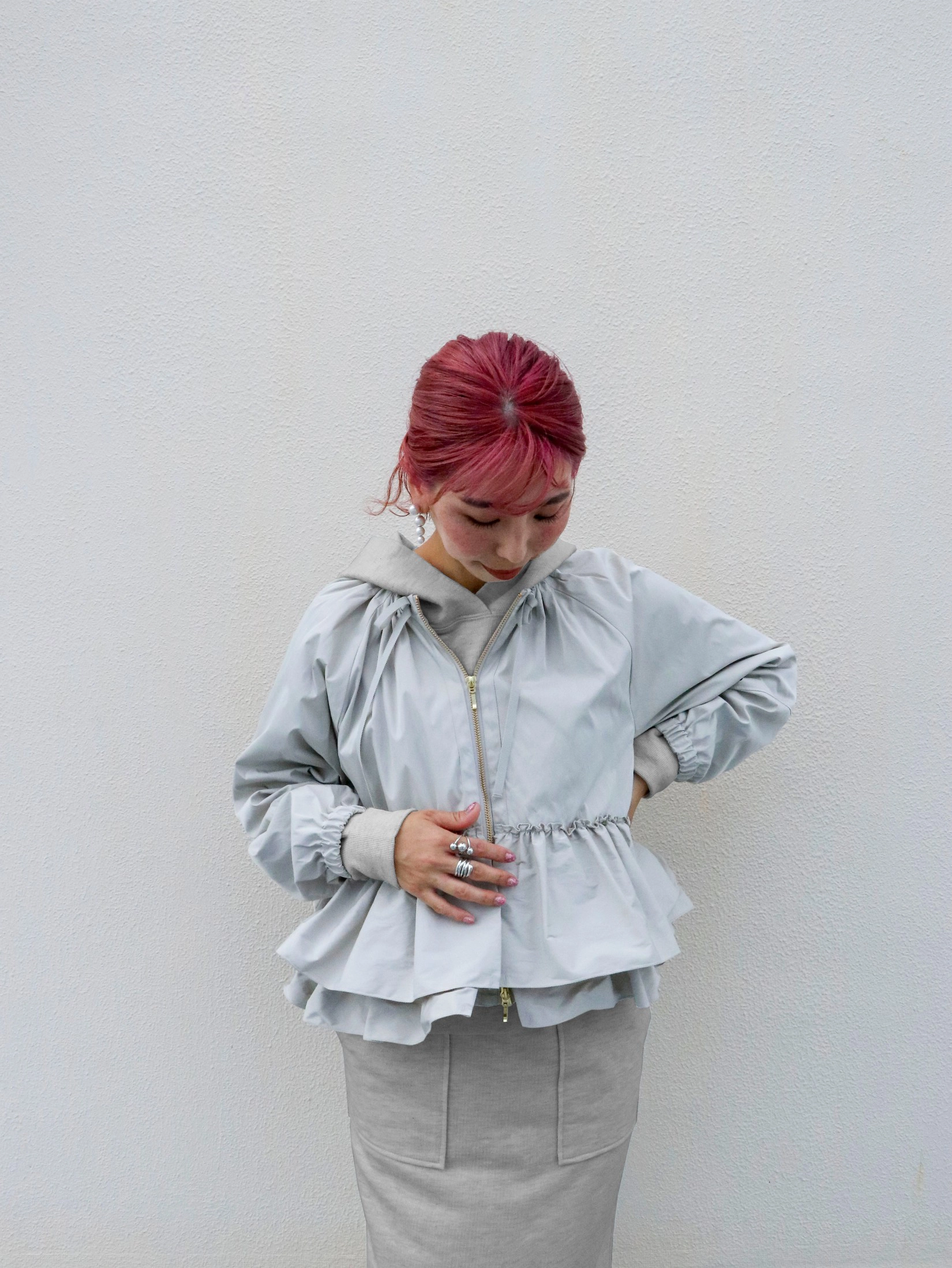 グレーの裏毛フーディーとスカートのセットアップ。 ラフな着心地ながらシルエットとワントーンの色味でカジュアル過ぎない大人のこなれ感がでる。 フリルのディテールが女性らしさを添えるブルゾンもラフな雰囲気は崩さずにコーディネートにマッチ。