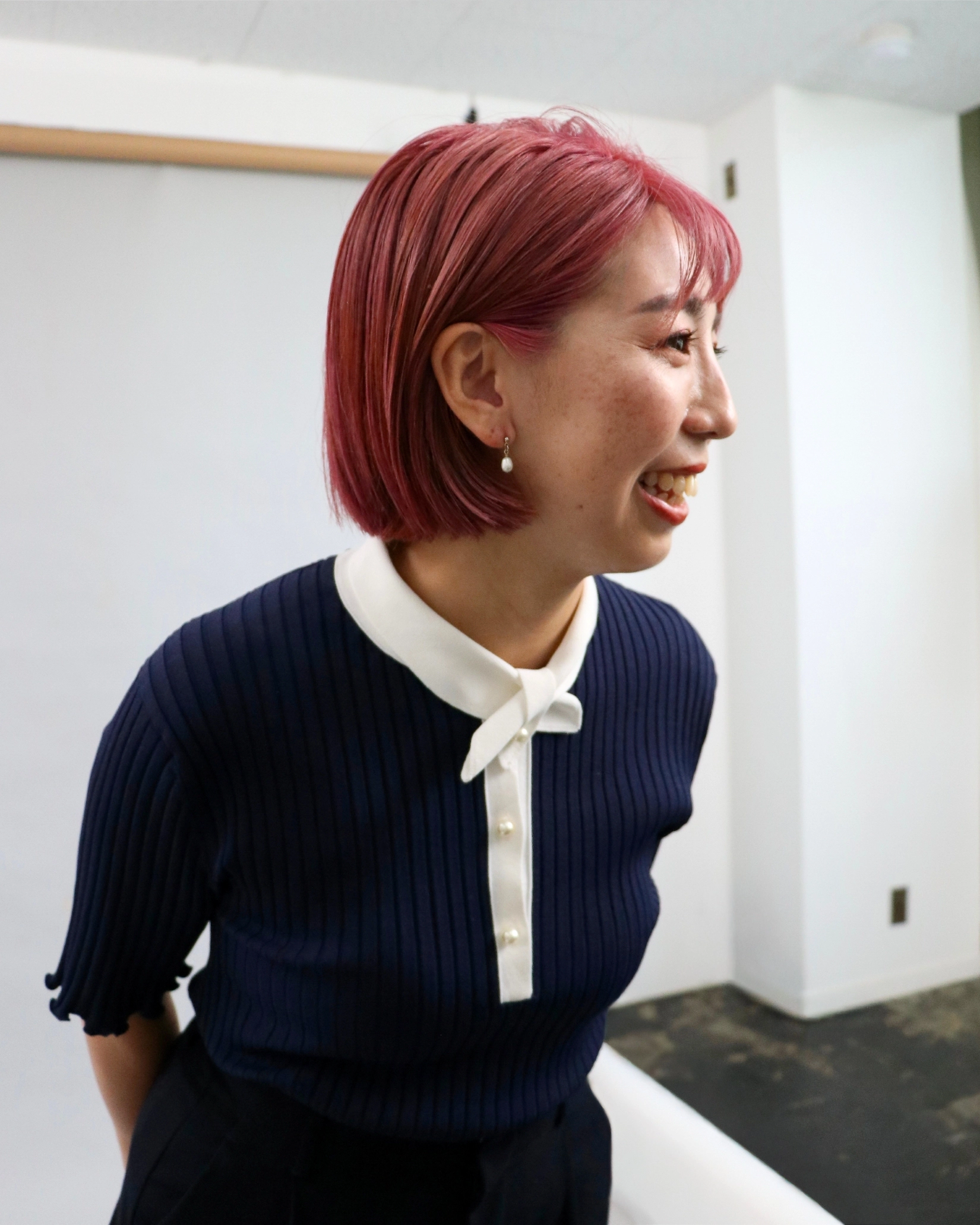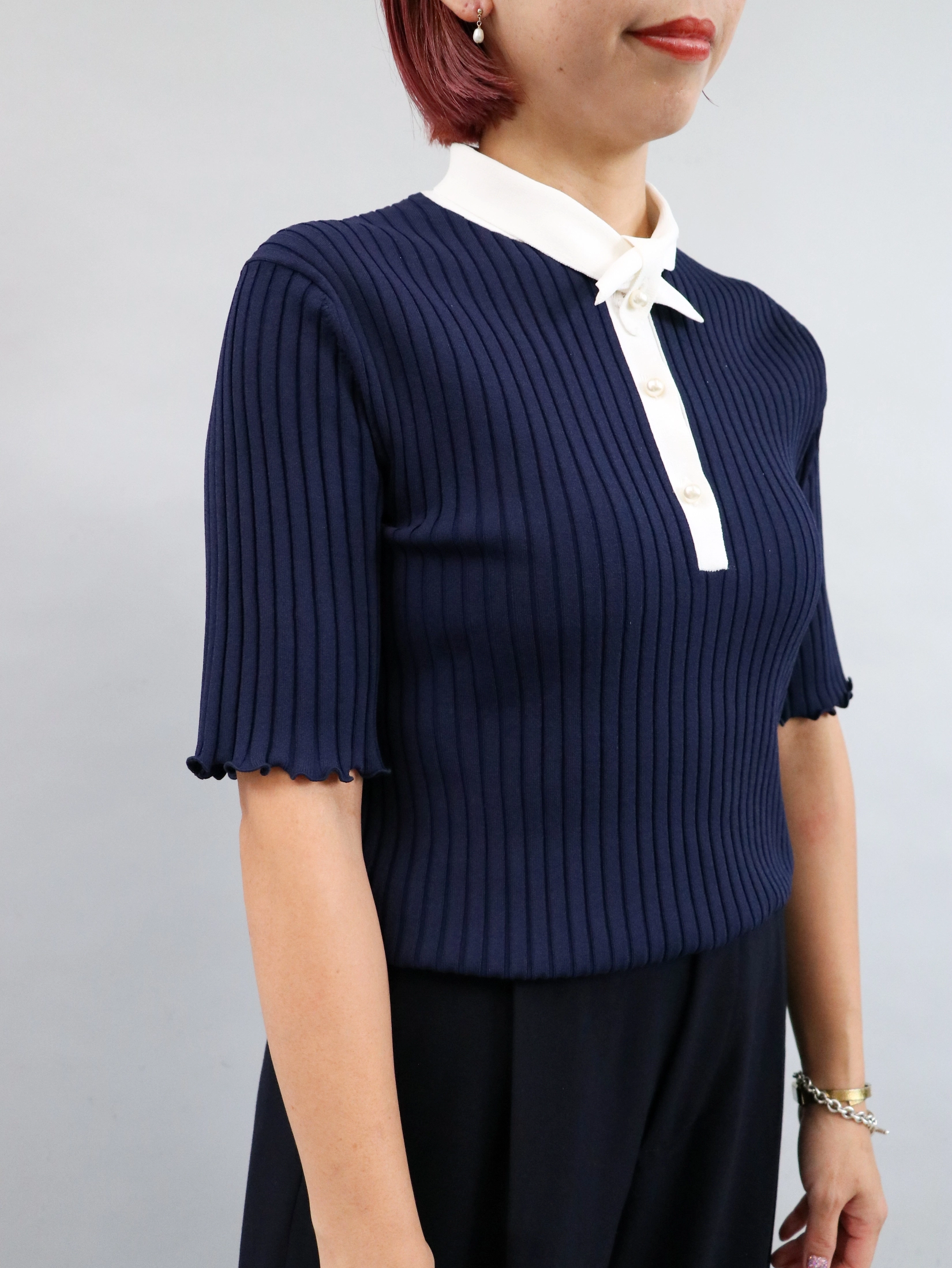 ネイビー×ホワイトのクラシカルな配色で上品に仕上げたスタイル。襟付きリブニットが端正な印象を与えてくれる。 差し色のイエローのバッグも鮮やかなアクセントになる。