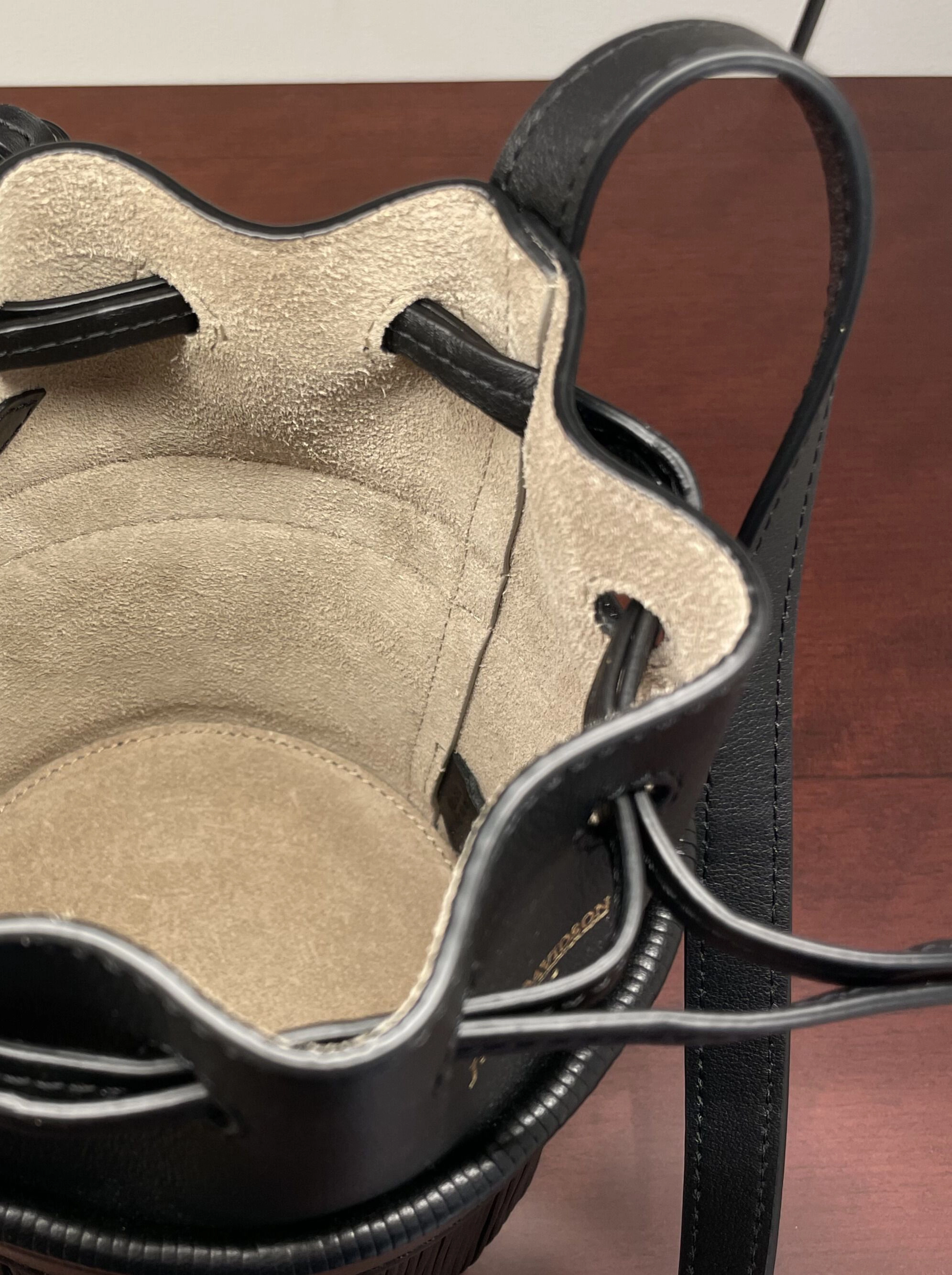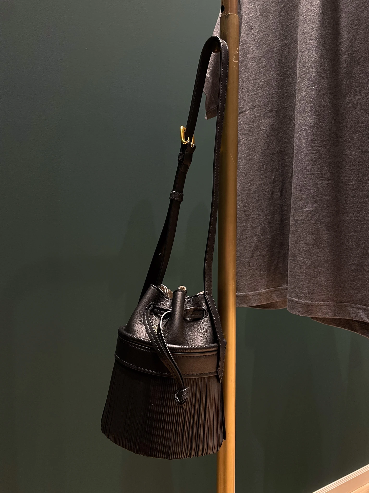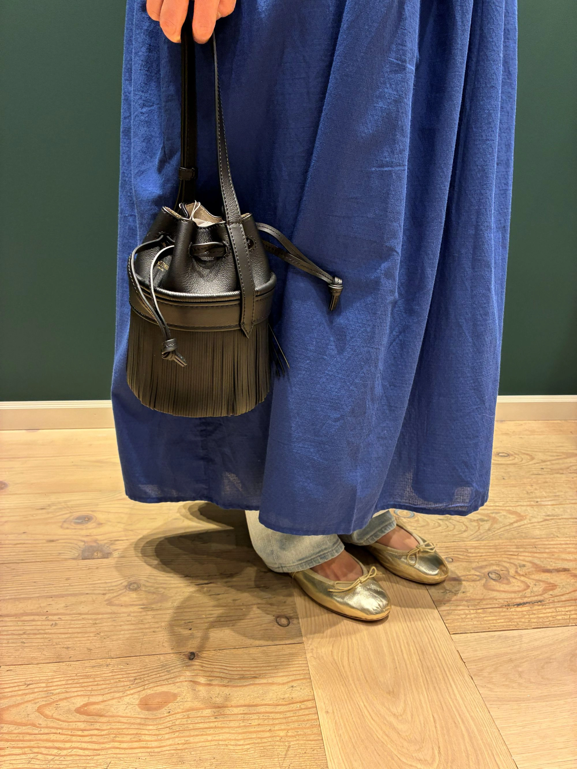 柔らかなカーフレザーに繊細なフリンジが揺れる、リュクスな雰囲気のバッグです。 ゴールドバックル付きのストラップが、さらなる華やかさを添えます。