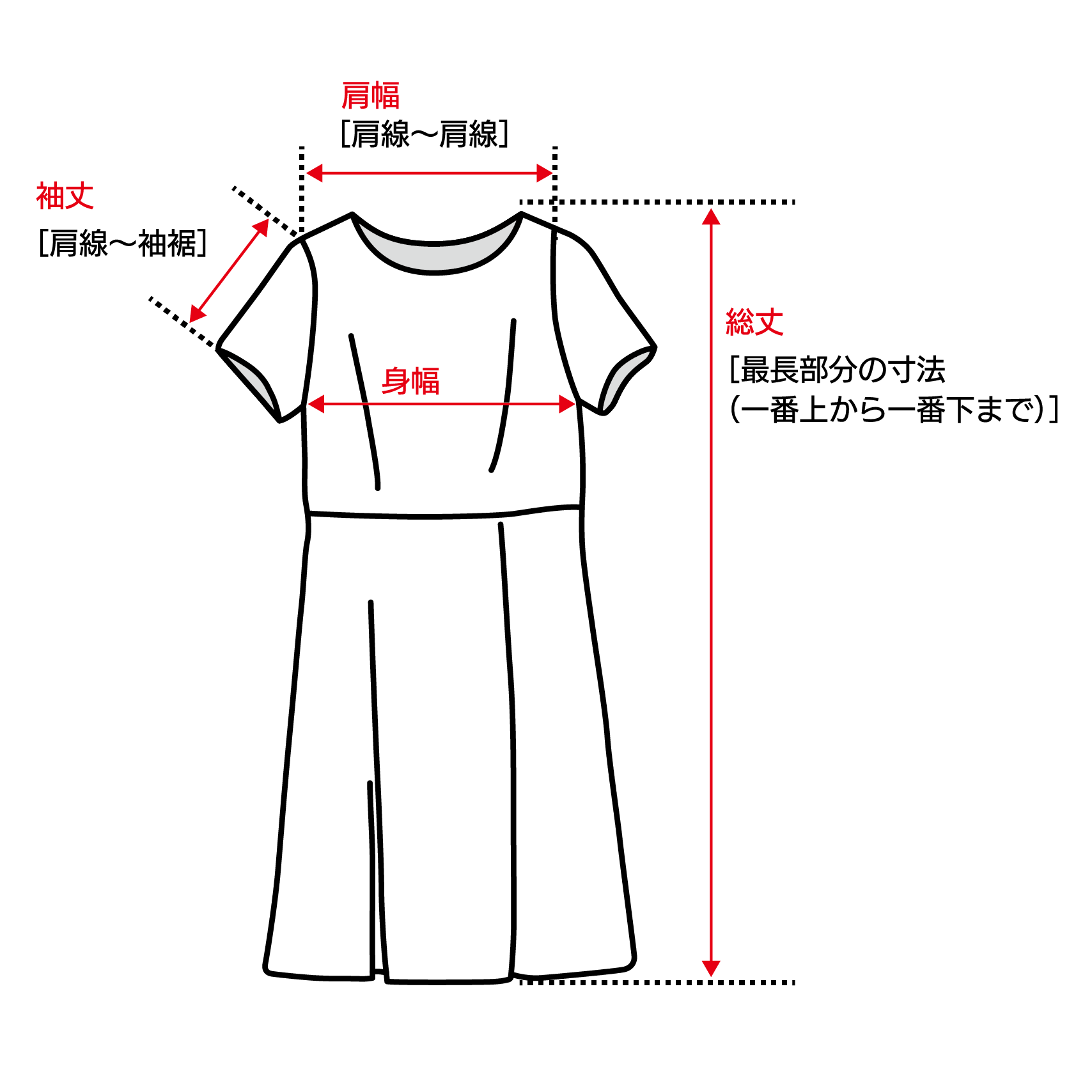 ・裾の長さが形状によって異なる場合は最長の長さを「着丈・総丈」とします。