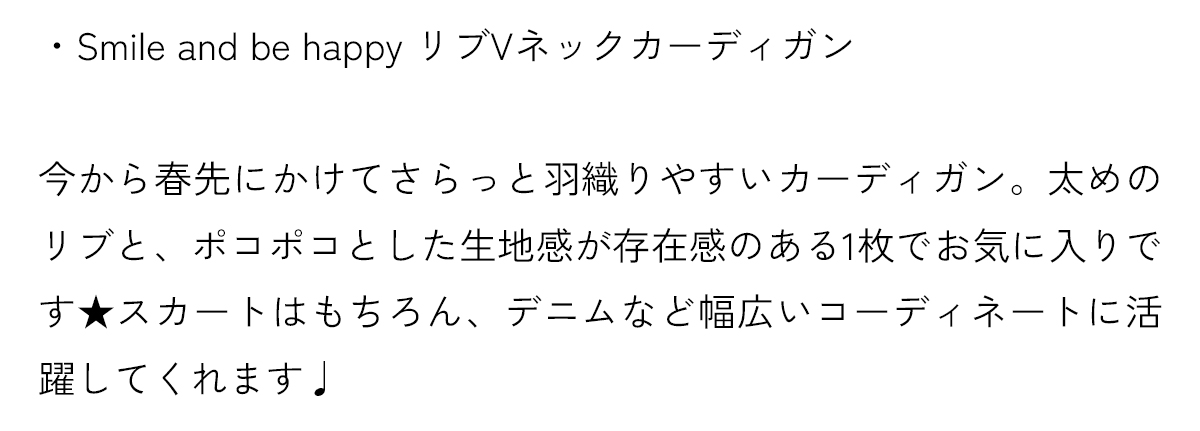 cardigan : Smile and be happy ¥17,600 ▶CHECK
