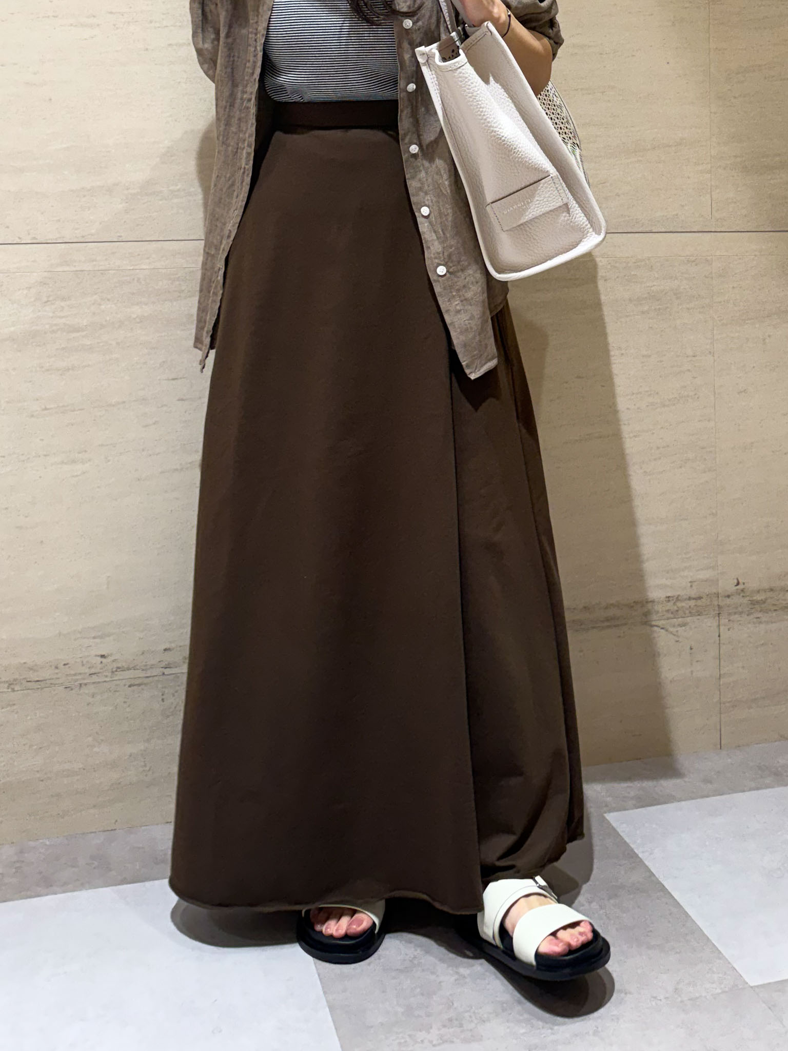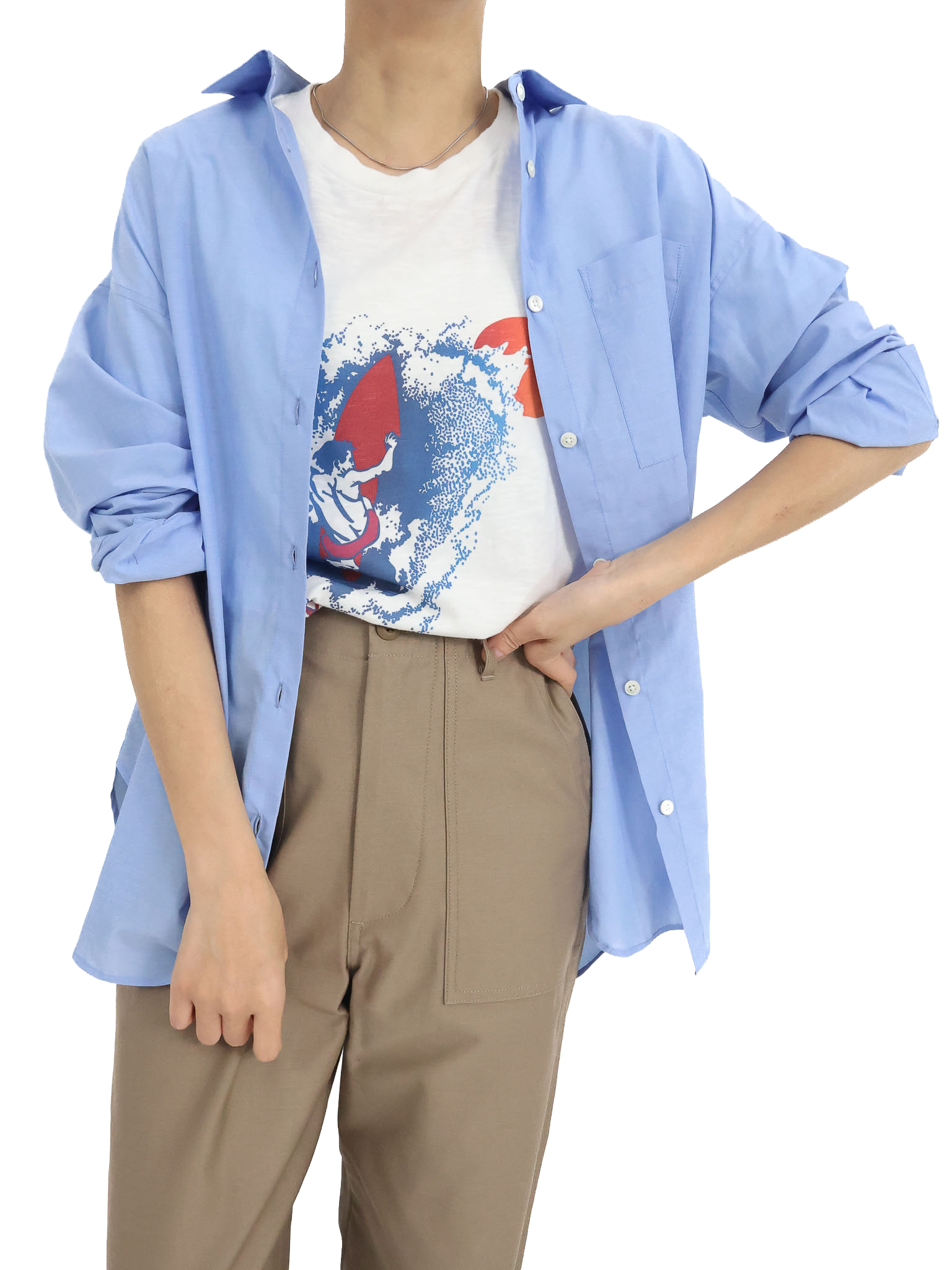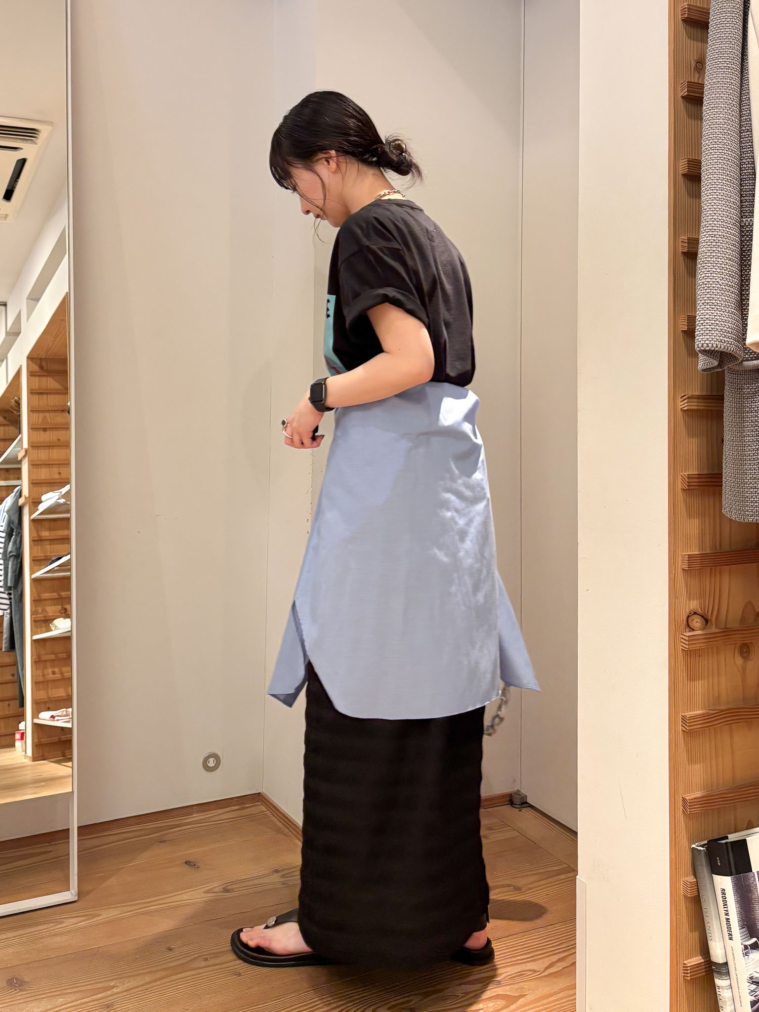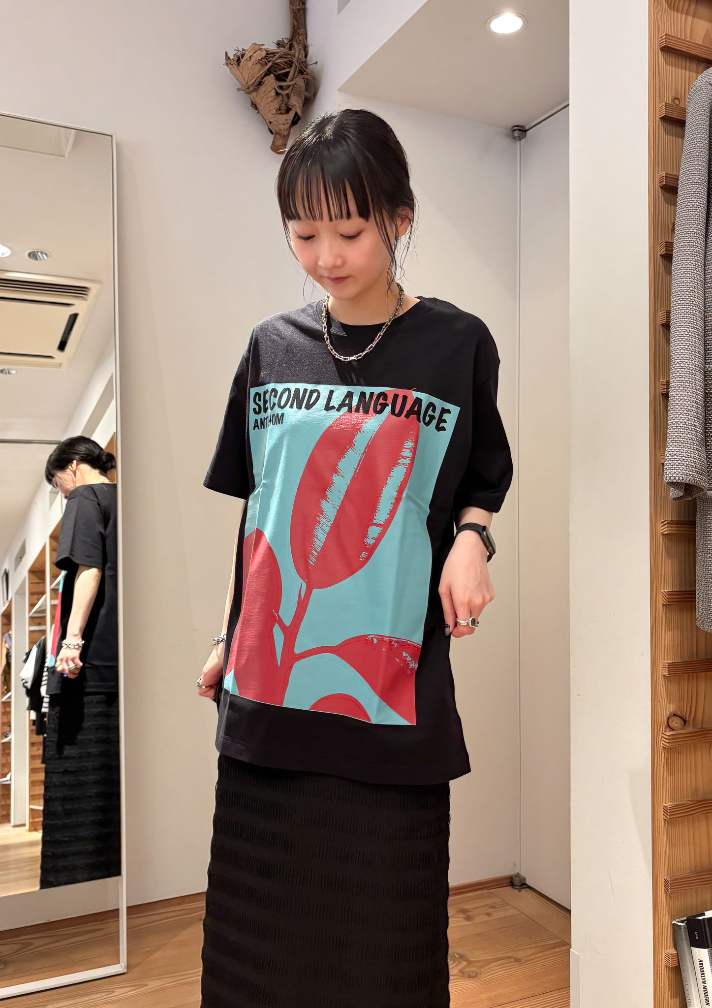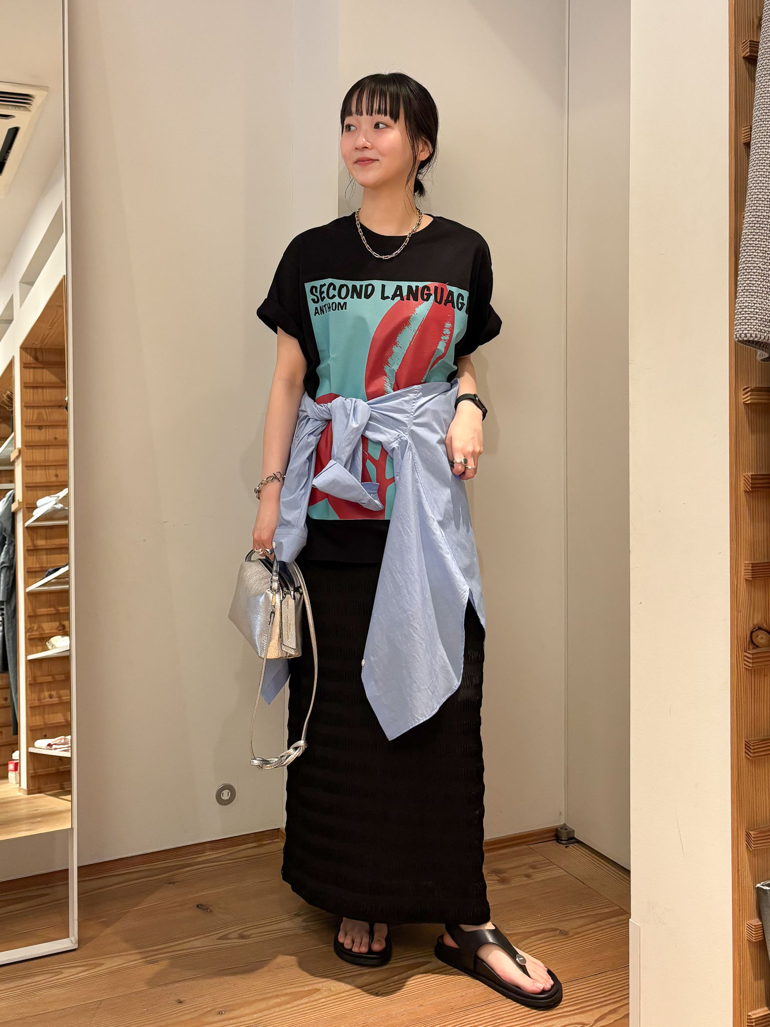 アントムのプリントTシャツを主役にコーディネート。Tシャツがより映えるように、シンプルにスカートで合わせました。ポイントにシャツを加えることでメリハリが生まれ、スタイルアップ効果も◎